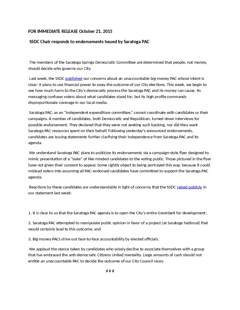 As a point of fact, Saratoga PAC is not a “Super PAC.” That’s the colloquial term for what Federal election law terms an “independent-expenditure only committee.” The latter is an entity that may not make contributions to candidate campaigns or parties, but which may engage in unlimited political spending independently of those campaigns. The money sources behind Super PACs are often cloaked in secrecy.