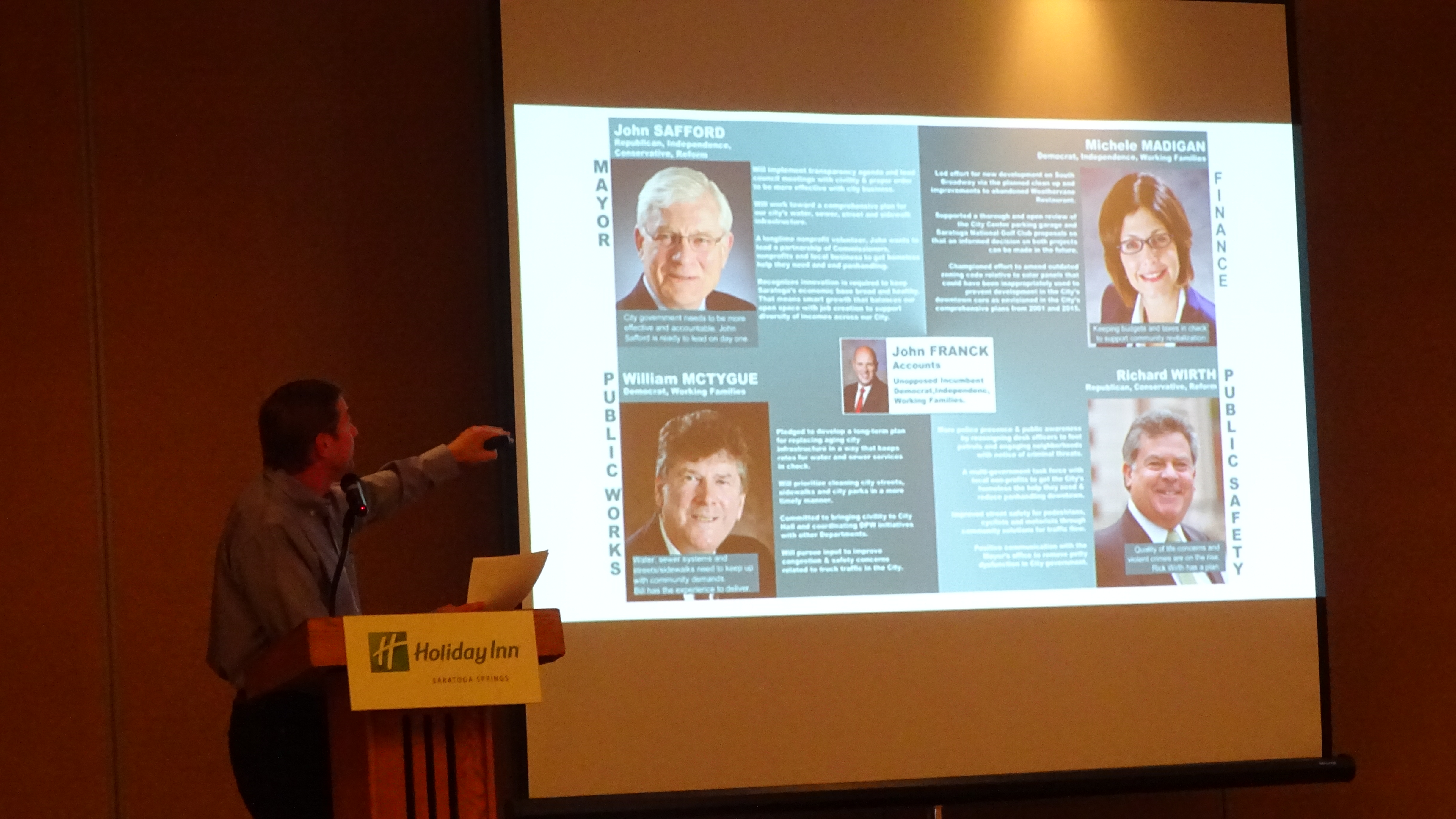 He continued by talking about the process of interviewing the current roster of candidates for public office. In effect, they were asked to answer the same questions which were posed by the survey. The public and candidate responses were then compared and candidates whose views most closely paralleled the public response were selected for endorsement. These were Republicans John Safford (Mayor) and Richard Wirth (Public Safety), plus Democrats Michele Madigan (Finance), Bill McTygue (Public Works), and John Franck (Accounts). In addition, Cynthia Young, Republican candidate for Malta Town Supervisor, was also endorsed.