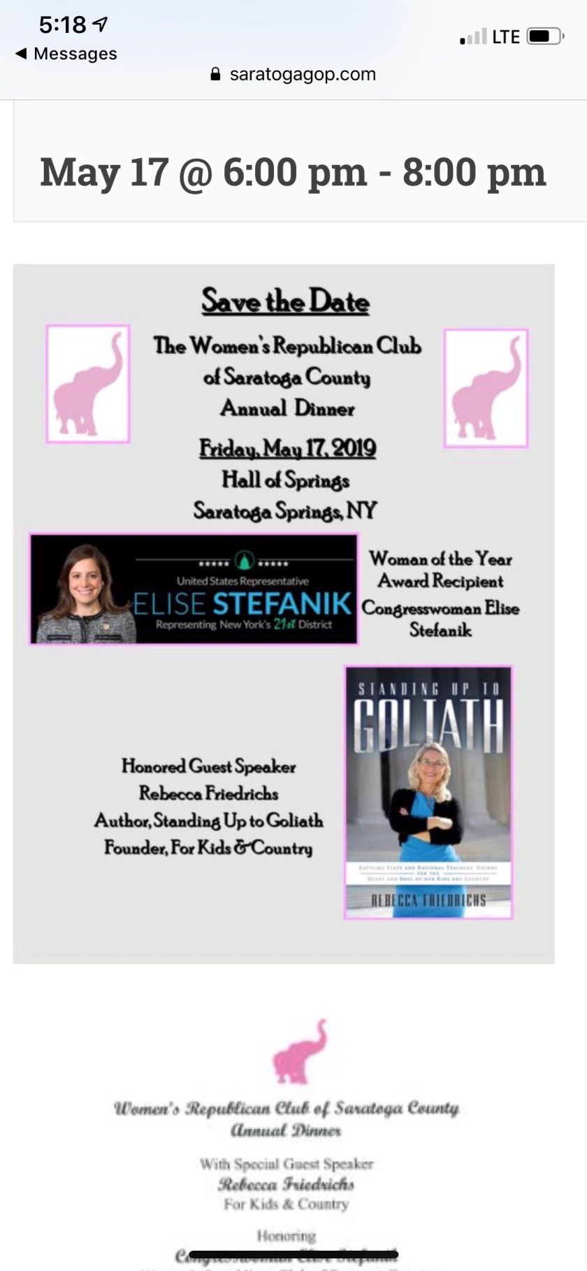 Todd Kerner, Saratoga County Democratic Committee Chair, sent me the following flyer which announces that the Saratoga County Women’s Republican Club will have Rebecca Friedrichs as their guest speaker at their upcoming dinner. Friedrichs was the plaintiff in the Supreme Court case (Friedrichs v. California Teachers’ Association) that was the precursor to the case that prohibited public employee unions from collecting partial dues from employees who were covered by union contracts. Friedrichs was to be featured at a dinner put on by New Choice NY that, as noted in an earlier post, had been scheduled to be held at Panza’s until Panza’s decided not to host them. I would note that New Choice was offering a free meal to those attending their dinner featuring Friedrichs. I’m wondering if the GOP women will be offering the same deal.
