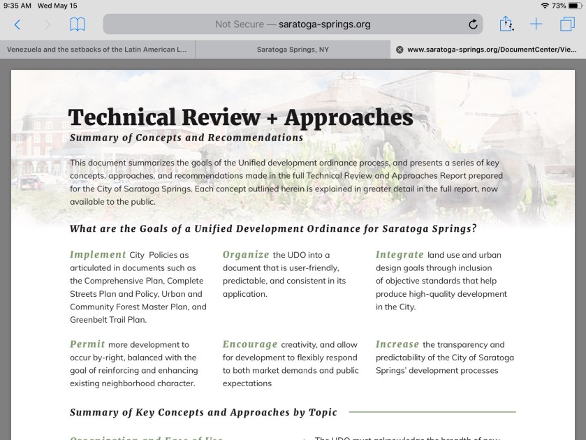 On Wednesday,May 22, the draft of the proposed Unified Development Ordinances (UDO) will be the subject of two presentations. From 12-2 the presentation will be at the Saratoga Springs Arts Center at 320 Broadway. From 5:30 to 7:30 the presentation will be at the Rec Center at 15 Vanderbilt.