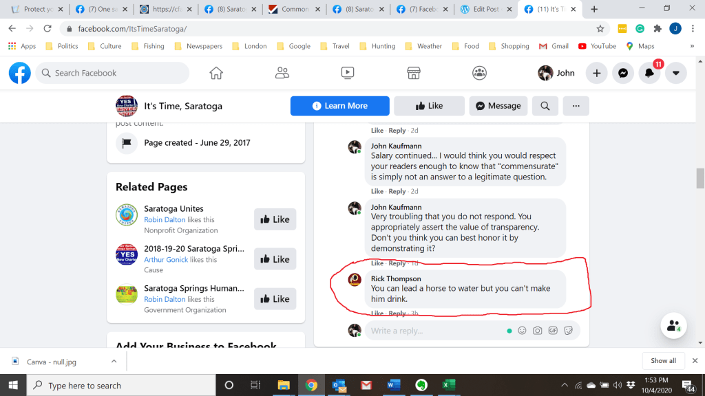 - From the moderator for the It’s Time Saratoga Facebook page: “It’s “commensurate” with the proposed mayor’s duties” (What does this mean?Most reasonable people would characterize this as a non-answer).