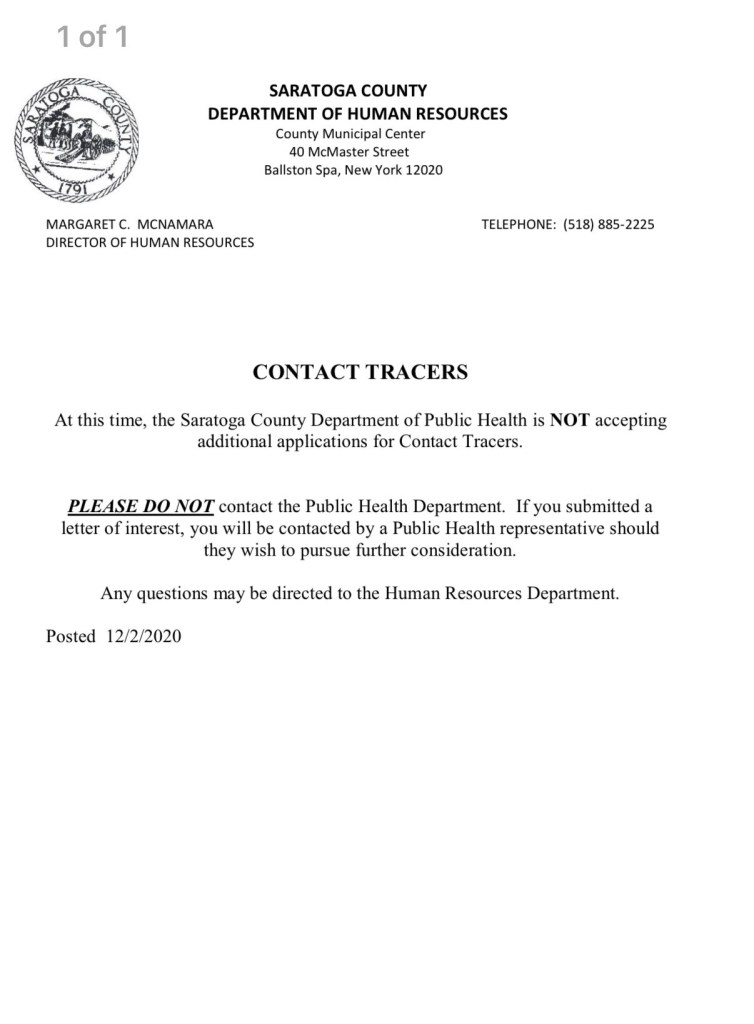 On Tuesday, December 15, 2020, the Saratoga County Board of Supervisors authorized the hiring of an additional 25 contract tracers which brings the authorized number to 75. Yet the county has stumbled for months unable to fill the original target of 50 set back in May.