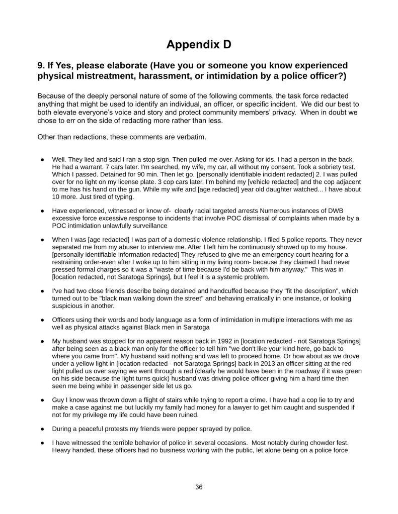 The analysis had two appendices. One involved comments from people elaborating on their, or someone they know’s, bad experiences with the police in general (any police not just the local police). The other appendix involved suggestions on how to improve our local police department.