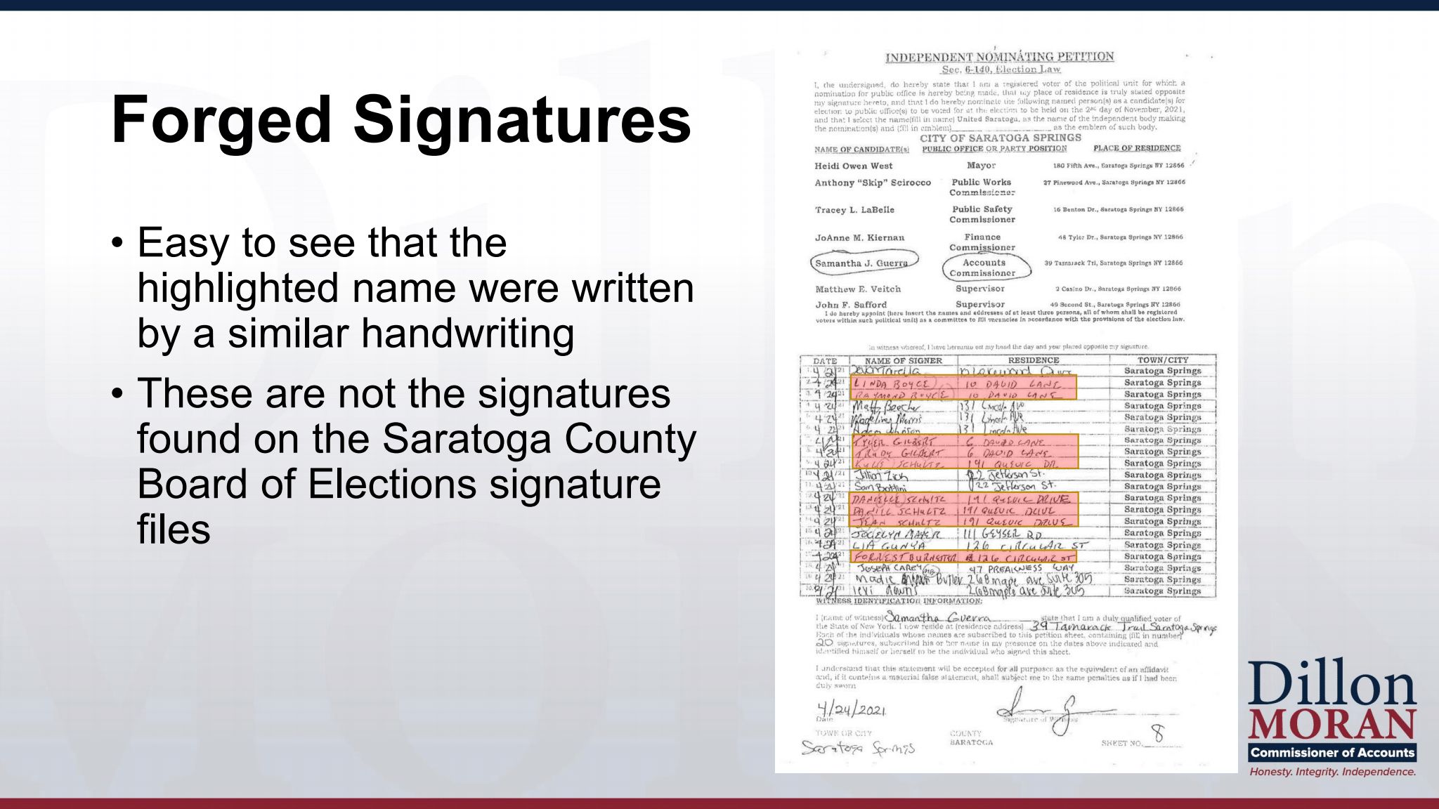 Mr. Moran, who is running for Commissioner of Accounts, alleges that his Republican opponent, Samantha Guerra, forged twenty-five signatures on the United Saratoga petitions.