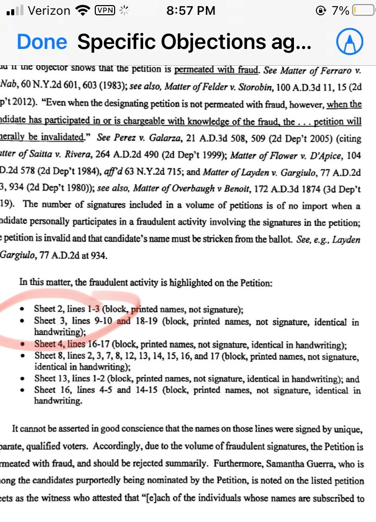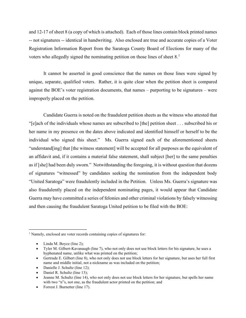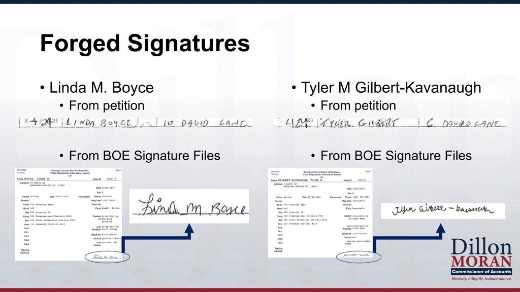 In support of his allegations he included a number of images comparing some of the signatures on the petitions with the registration signatures maintained at the Saratoga County Board of Elections.