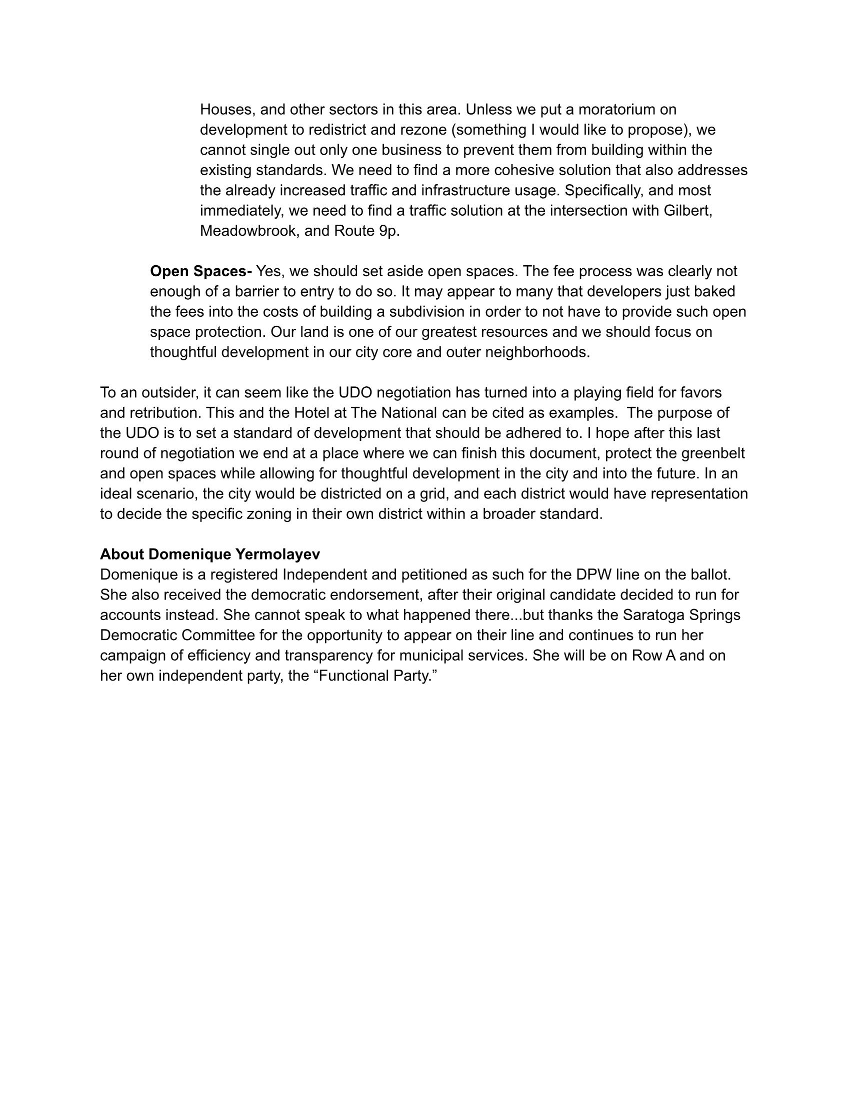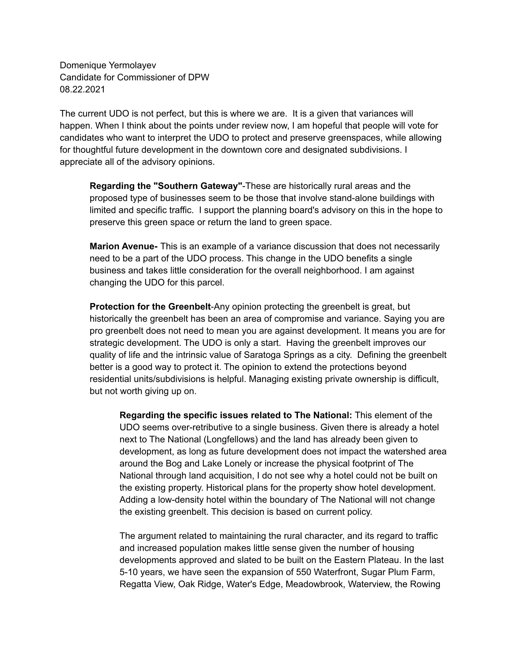 Saratoga Springs has devoted more than 5 years and countless resources in developing its Unified Development Ordinance (UDO). Multiple experts including city employee’s and outside consultants have contributed to its formation. I respect our sitting Planning Board and their advisory opinion. I also respect the opinions of the various experts who have helped to form our UDO. I understand the impact this ordinance will have on shaping our city’s future, and appreciate all the work that went into forming the current UDO.