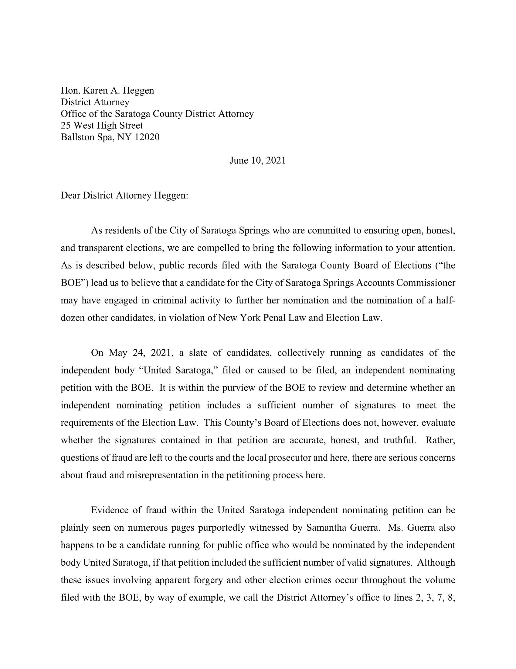 The letter requests that not only should the particular twenty-five signatures out of 630 plus be ruled as invalid but that all the petitions, including those circulated by other persons, should be disqualified and all the candidates be denied the United Saratoga ballot line.