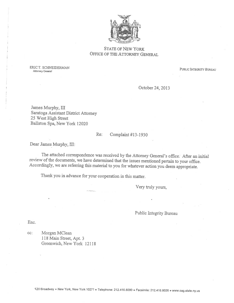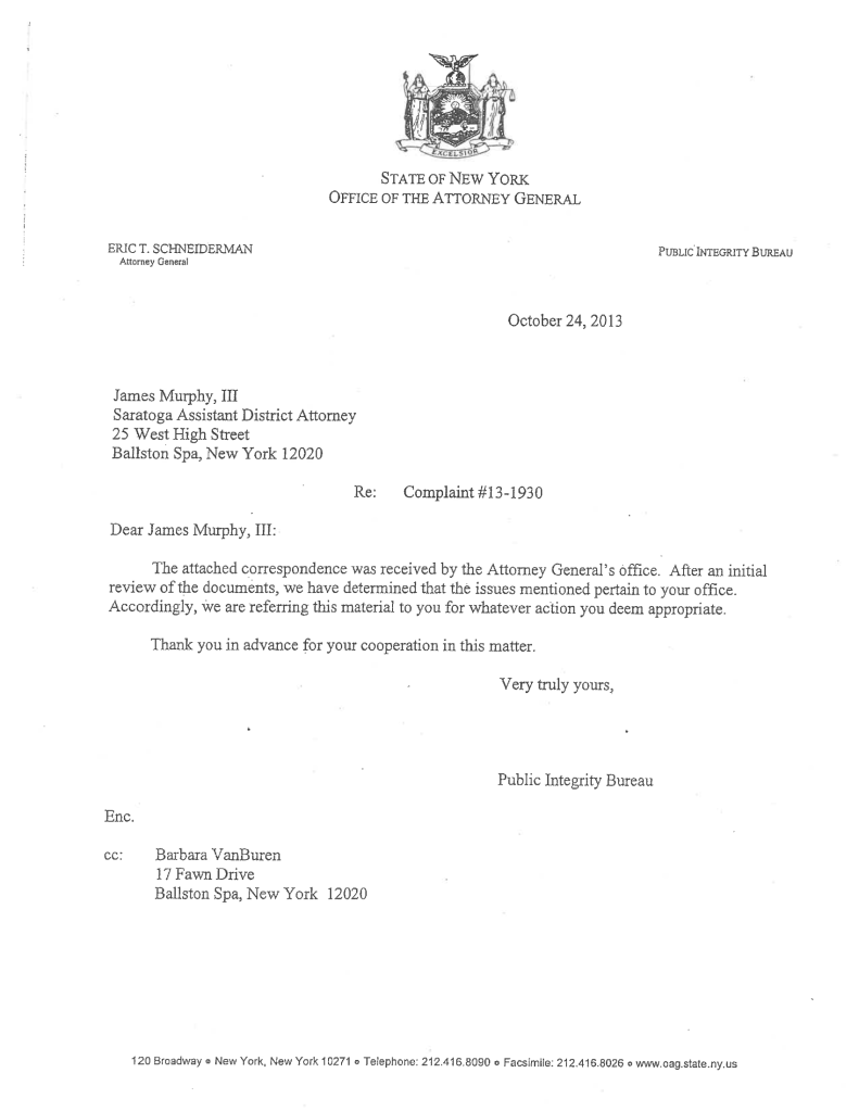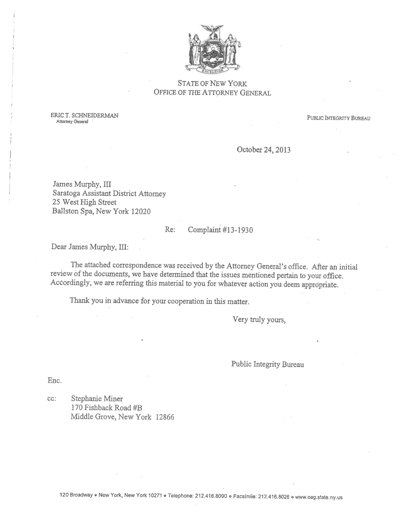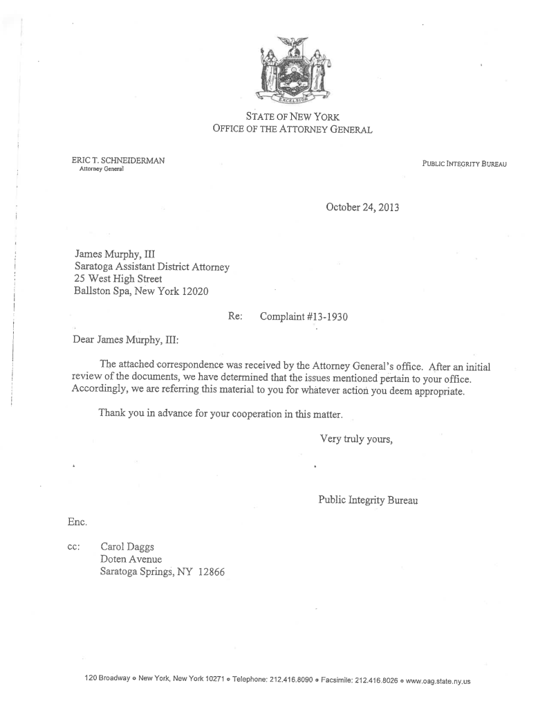 Several weeks ago Public Safety Commissioner Robin Dalton was kind enough to provide me with the documents below. They represent the 2013 correspondence from the then-Attorney General, Eric Schneiderman, to the Saratoga County District Attorney’s office.