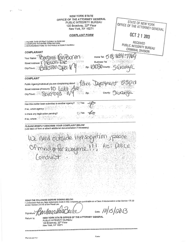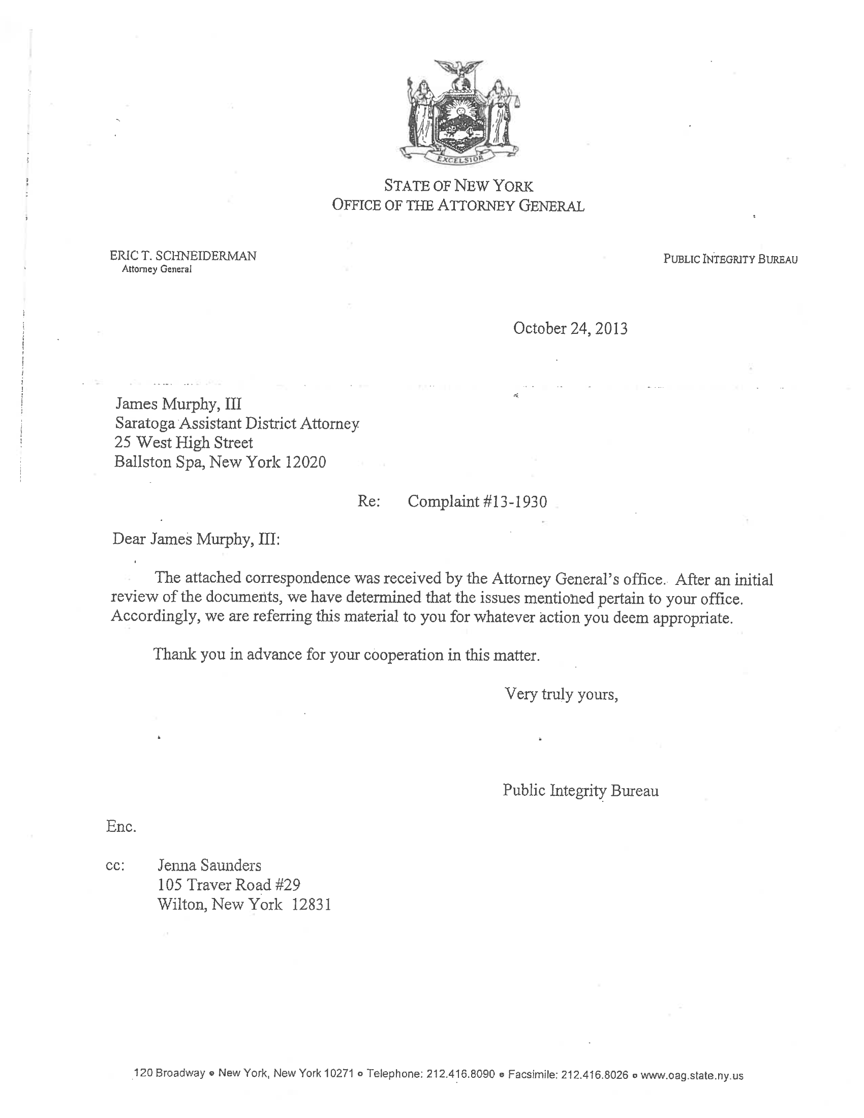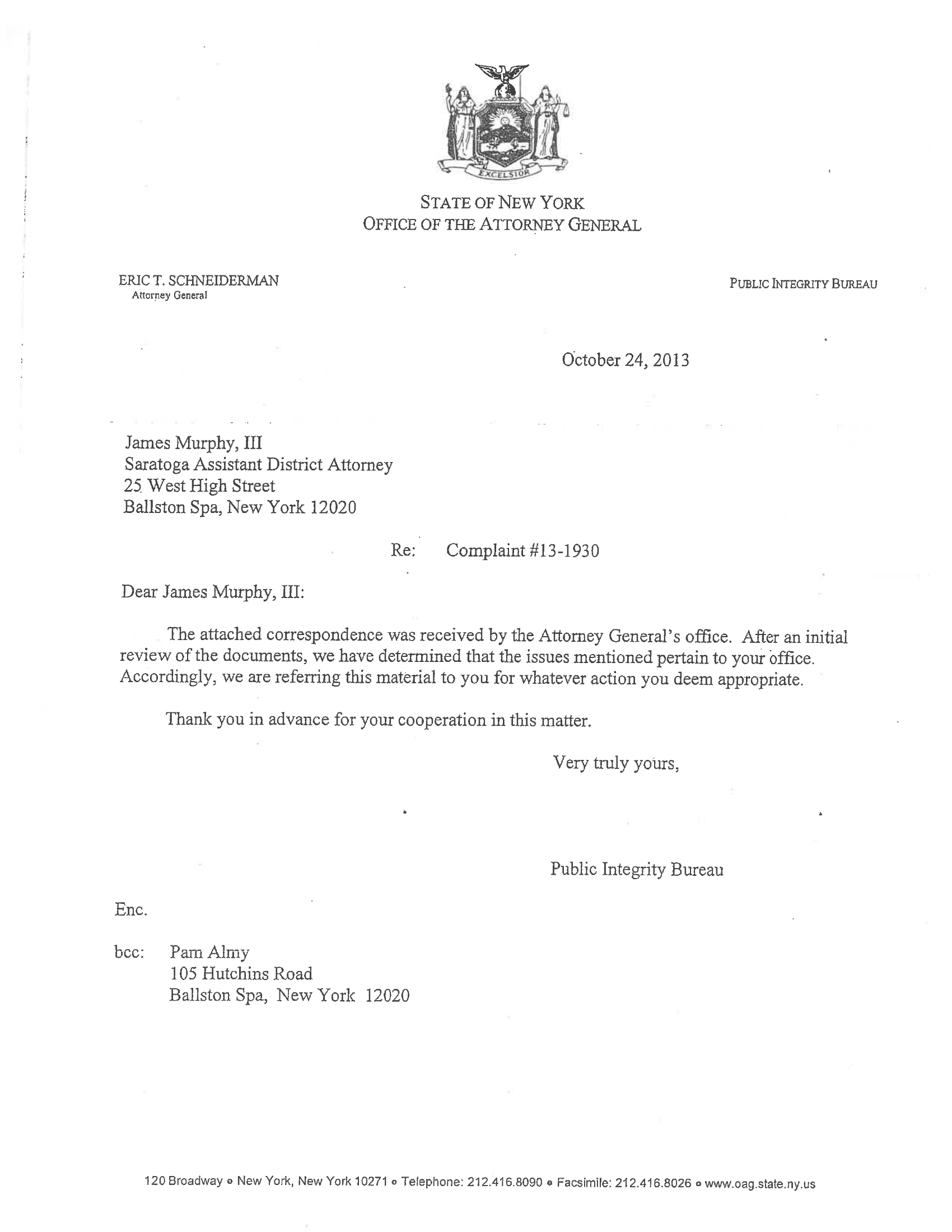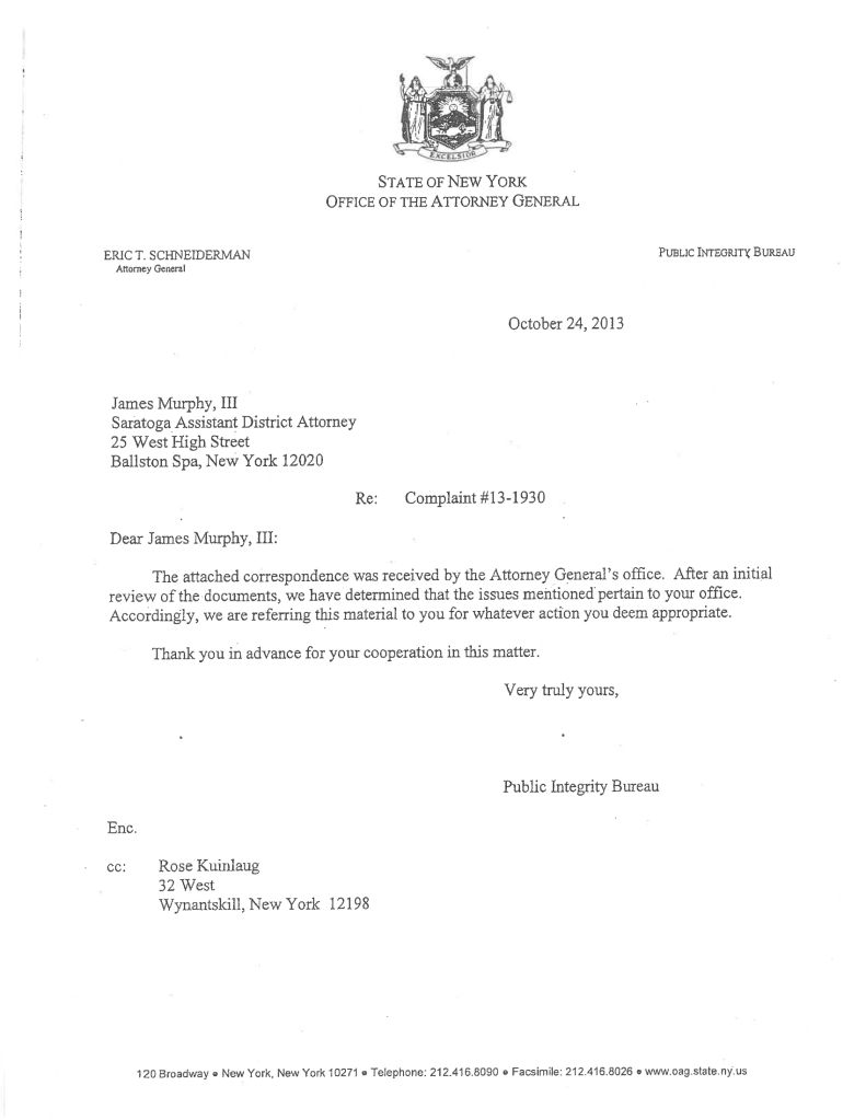 Several weeks ago Public Safety Commissioner Robin Dalton was kind enough to provide me with the documents below. They represent the 2013 correspondence from the then-Attorney General, Eric Schneiderman, to the Saratoga County District Attorney’s office.