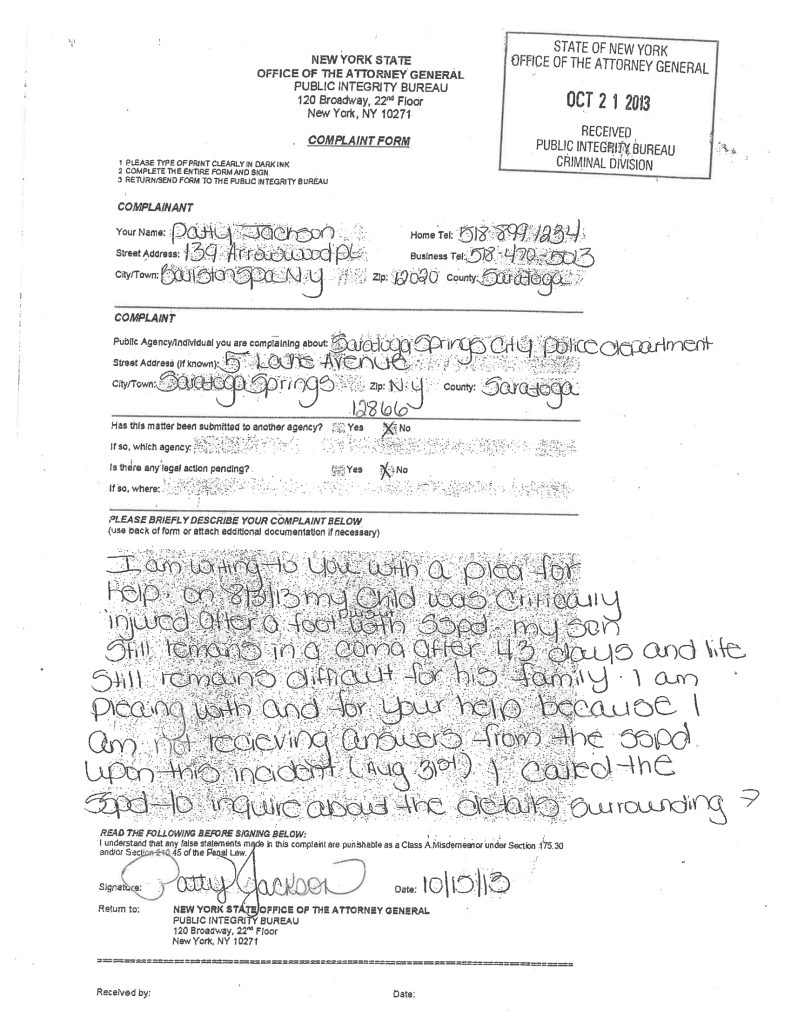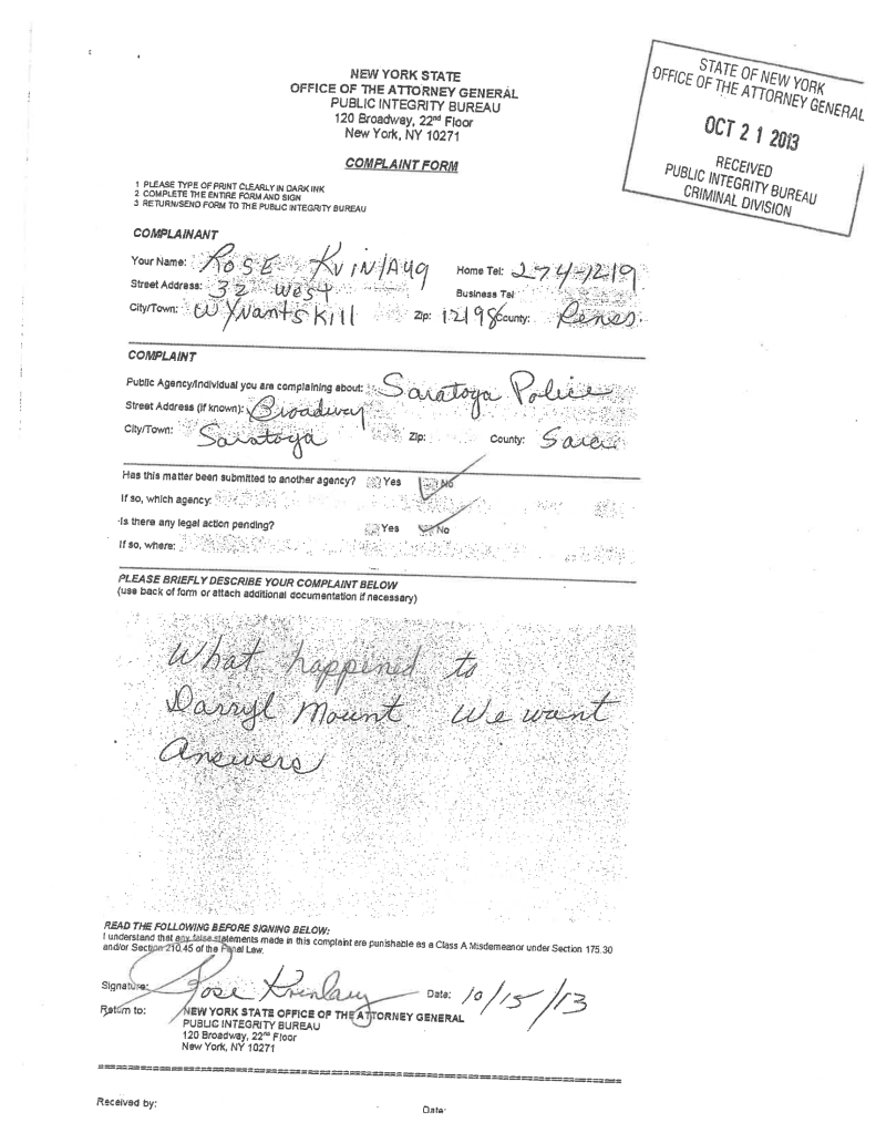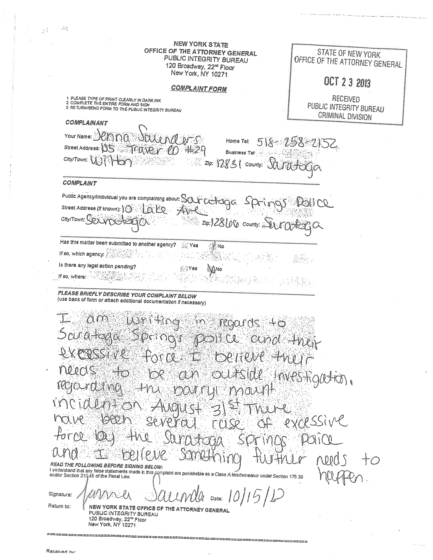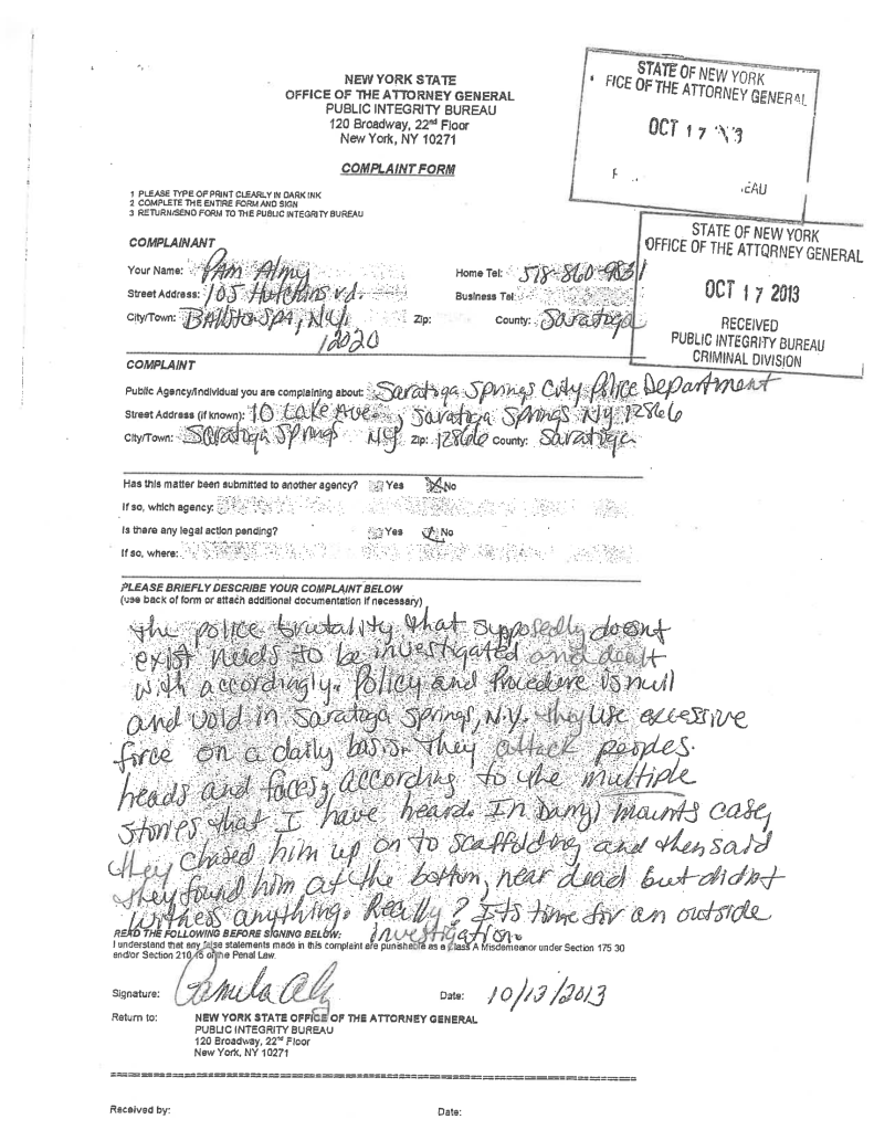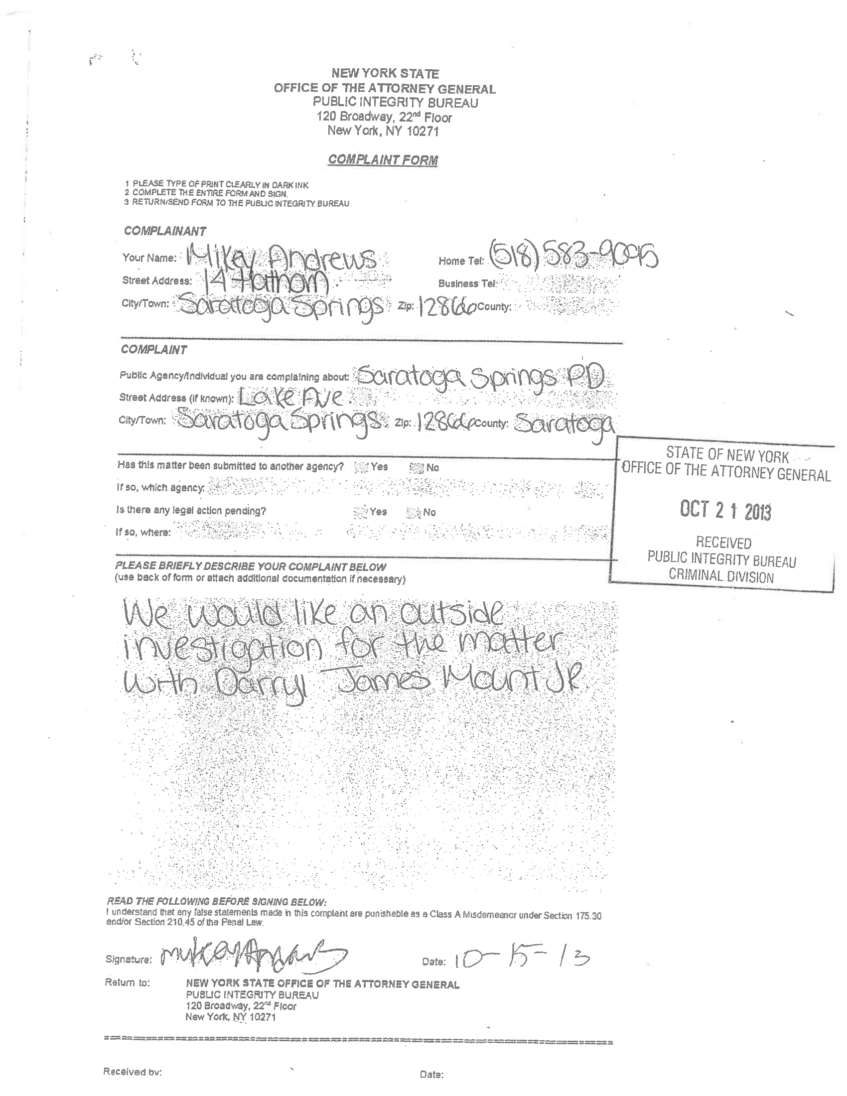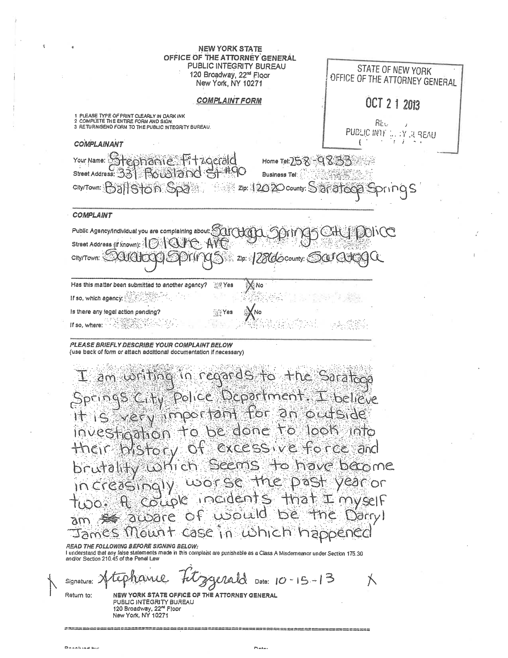 According to the documents the Attorney General received quite a number of complaints regarding the Saratoga Springs Police Department. Many of these complaints related to the Darryl Mount incident. As the readers of this blog know, Mr. Mount was mortally hurt following a police chase in Saratoga Springs in the fall of 2013.