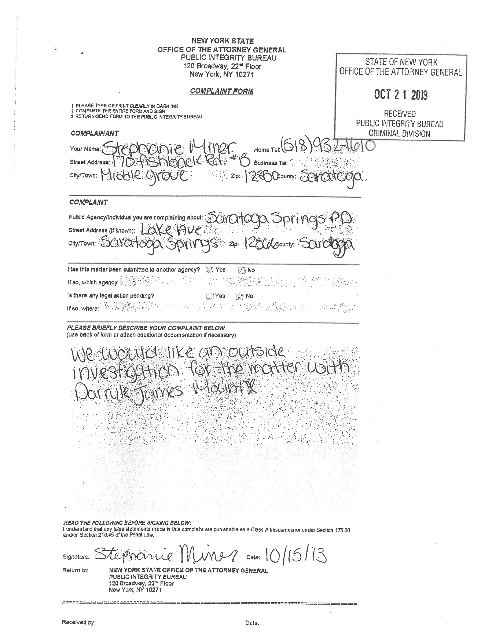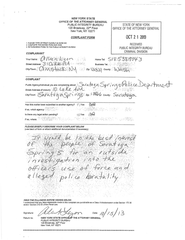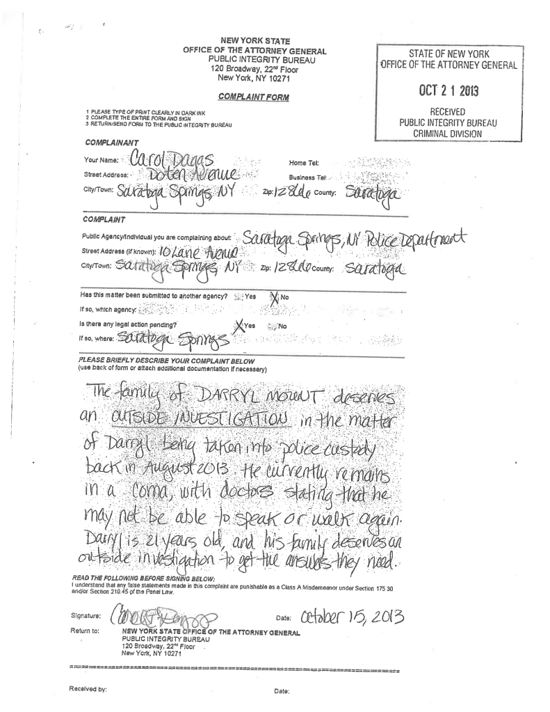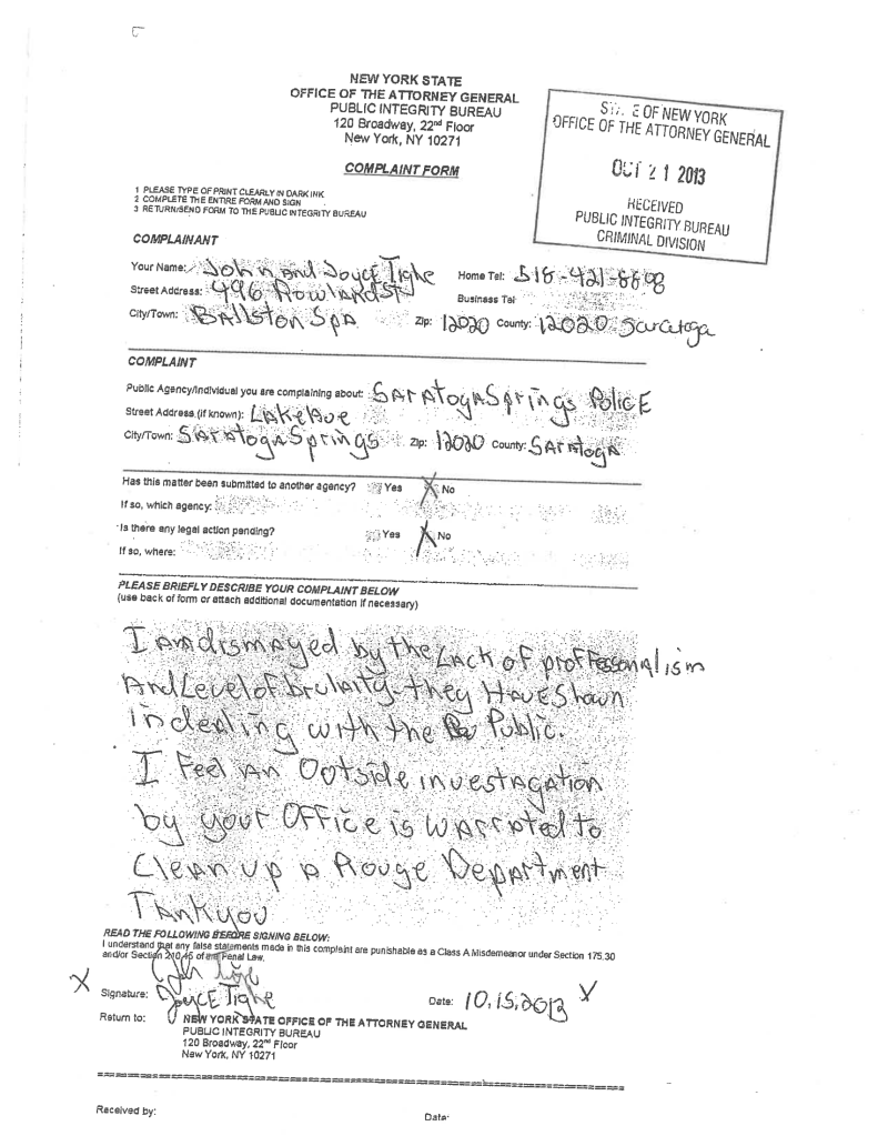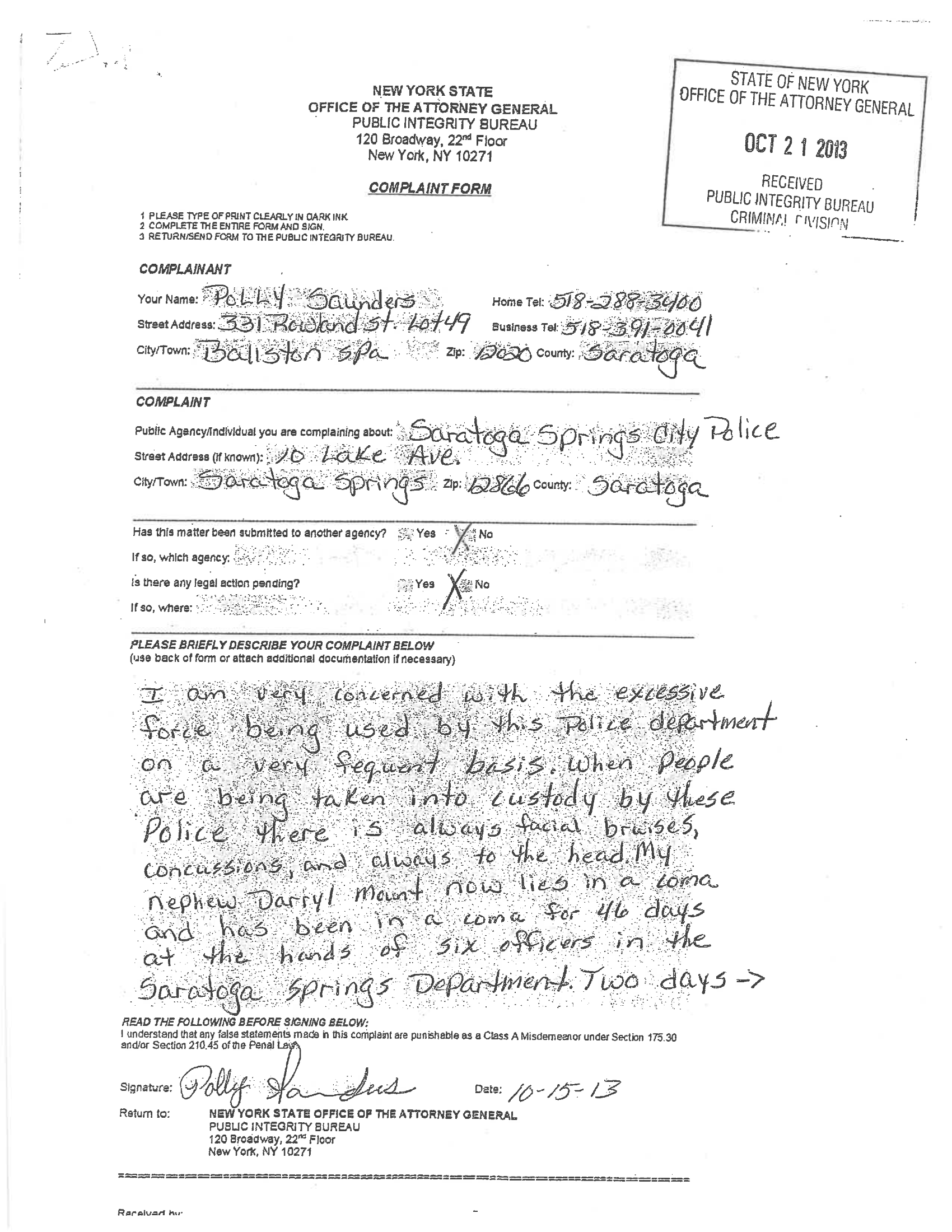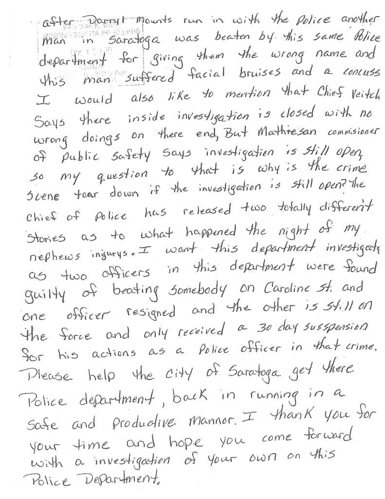 According to the documents the Attorney General received quite a number of complaints regarding the Saratoga Springs Police Department. Many of these complaints related to the Darryl Mount incident. As the readers of this blog know, Mr. Mount was mortally hurt following a police chase in Saratoga Springs in the fall of 2013.