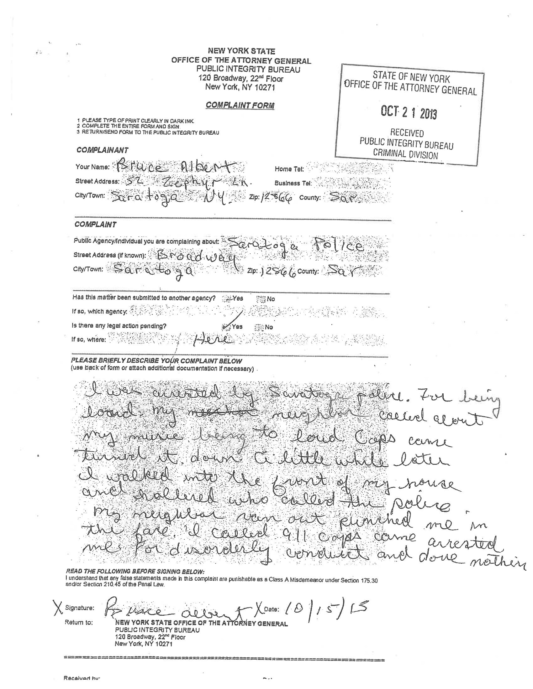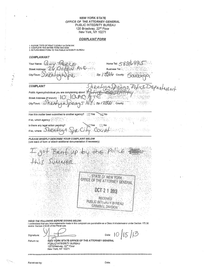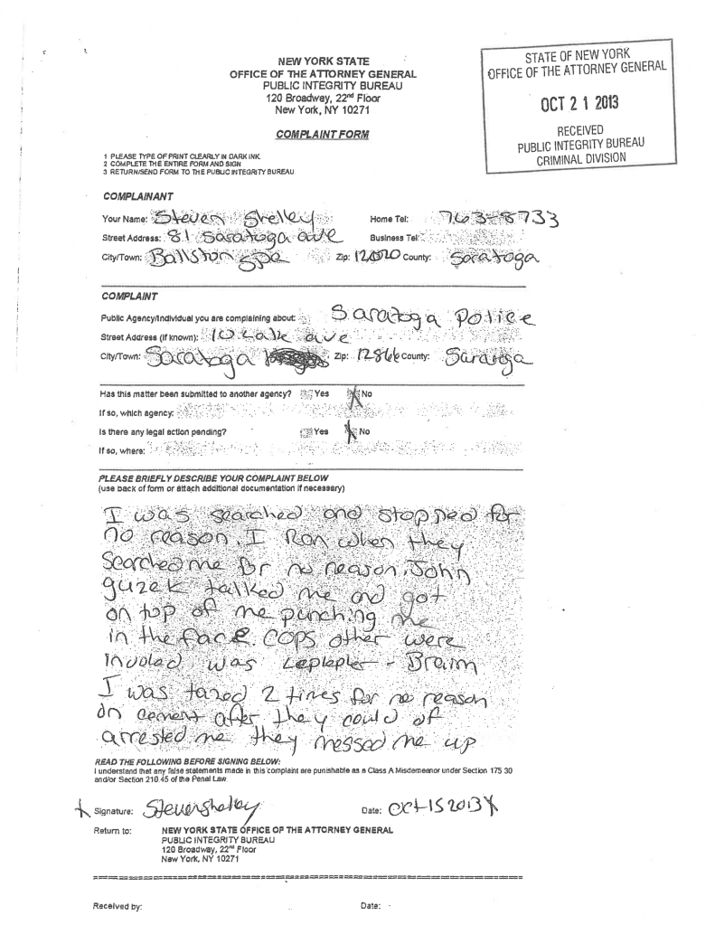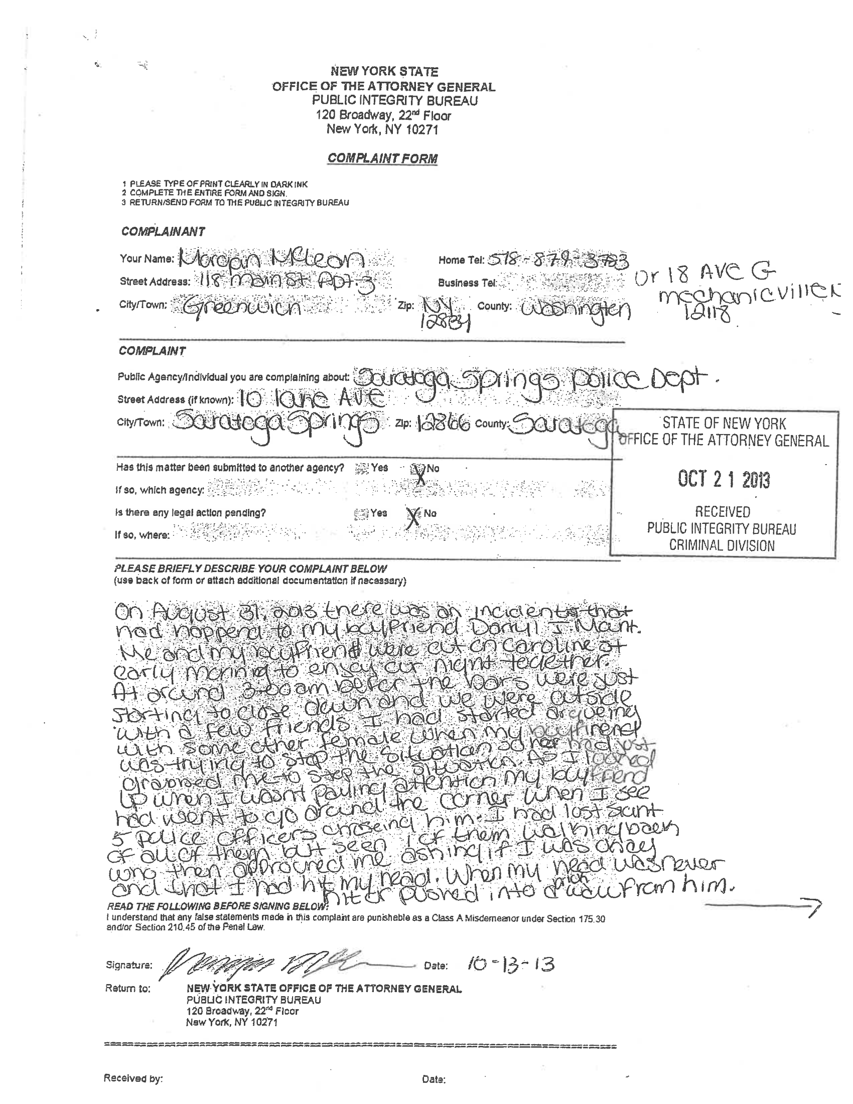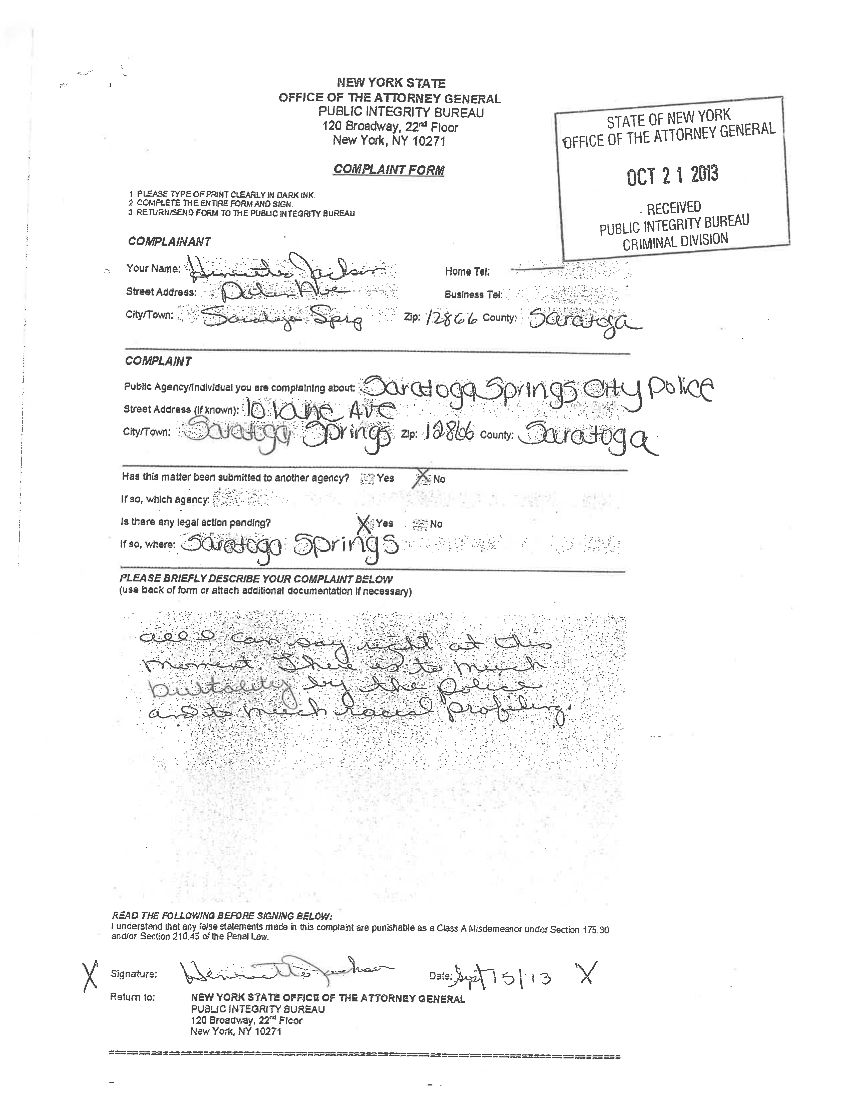 According to the documents the Attorney General received quite a number of complaints regarding the Saratoga Springs Police Department. Many of these complaints related to the Darryl Mount incident. As the readers of this blog know, Mr. Mount was mortally hurt following a police chase in Saratoga Springs in the fall of 2013.