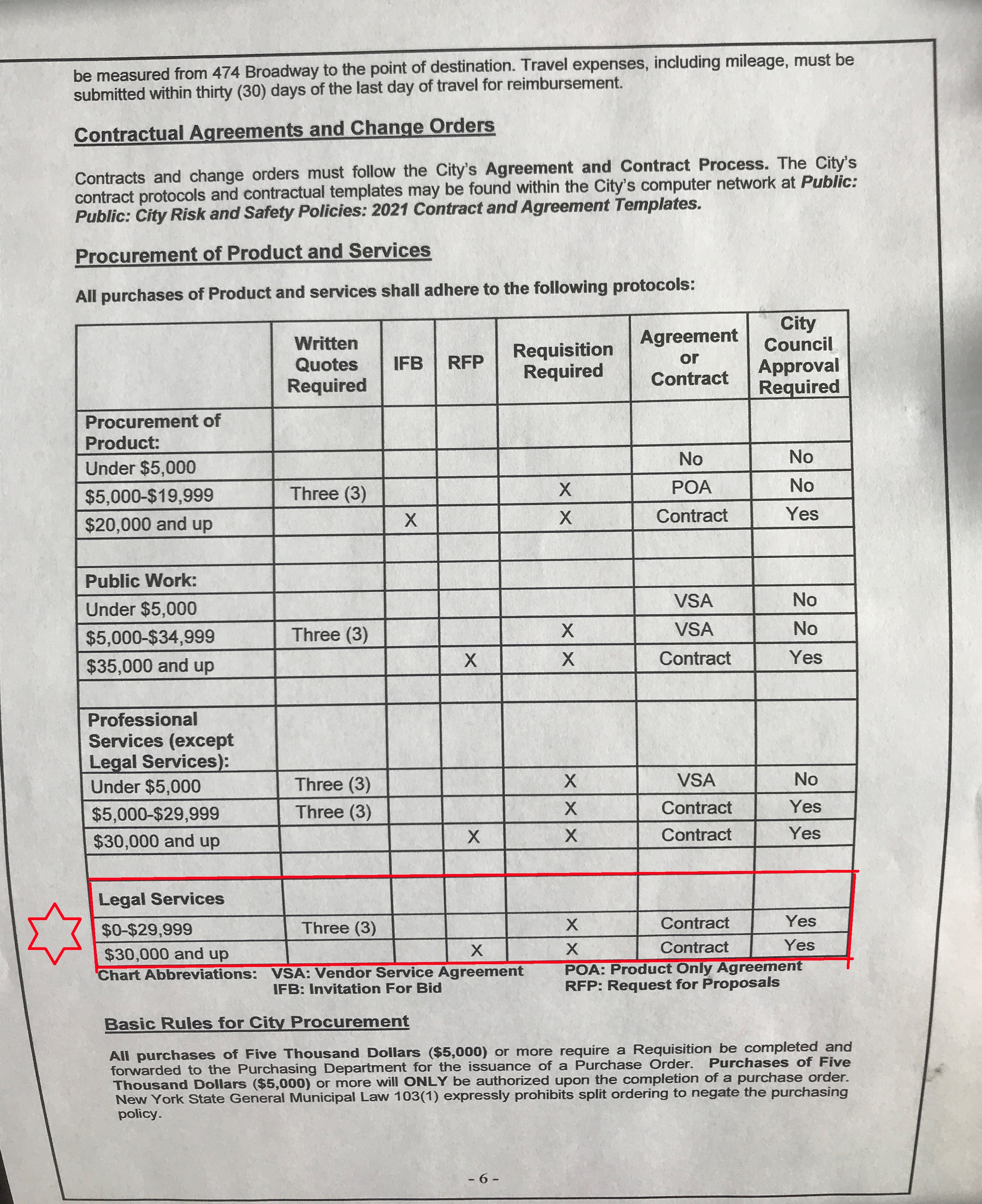 Harris Beach, Mayor failed to properly requisition for a monthly retainer fee of $10,000 for period Feb. 2010 through June 2010 for “general labor advice.” To honor the $10,000 invoice the mayor had to go to the Council. The accounts commissioner voted against the expenditure because “proper procedure was not followed.”