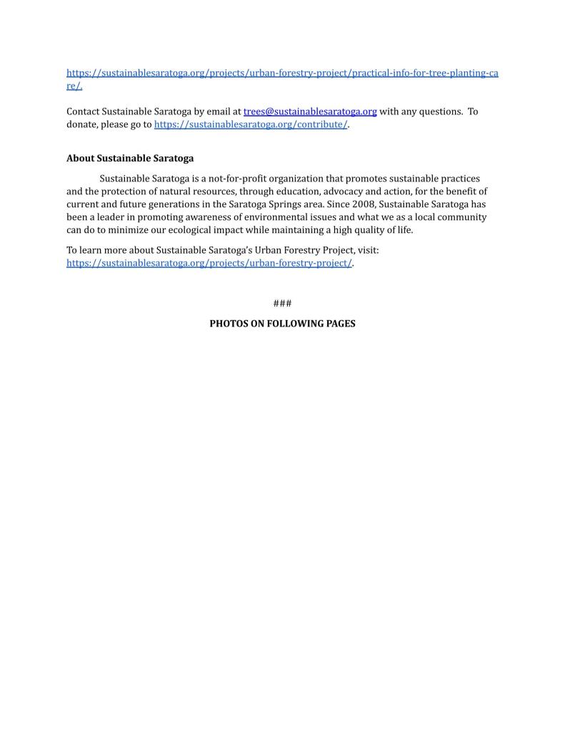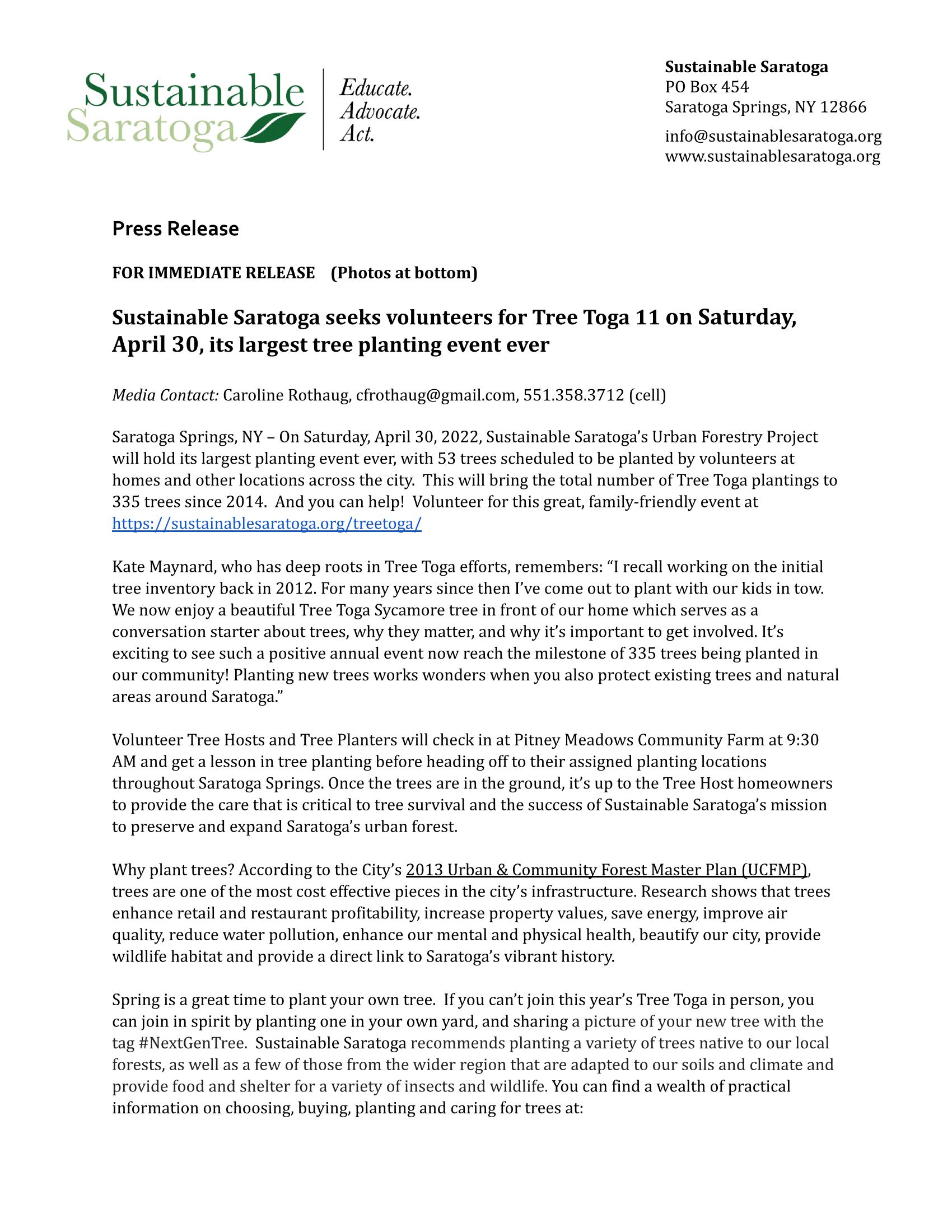 I remember planting trees with my kids when The Plan of Action replaced many trees on Broadway and adjoining streets, in front of the Drink Hall, and other places, back in 1973. Mayor Watkin and Commissioner Tom McTygue endorsed the effort, which was sponsored by the Chamber of Commerce as part of a revitalization of downtown. Saratoga Springs is blessed to have its beautiful tree-lined streets. Thanks, Sustainable Saratoga!
