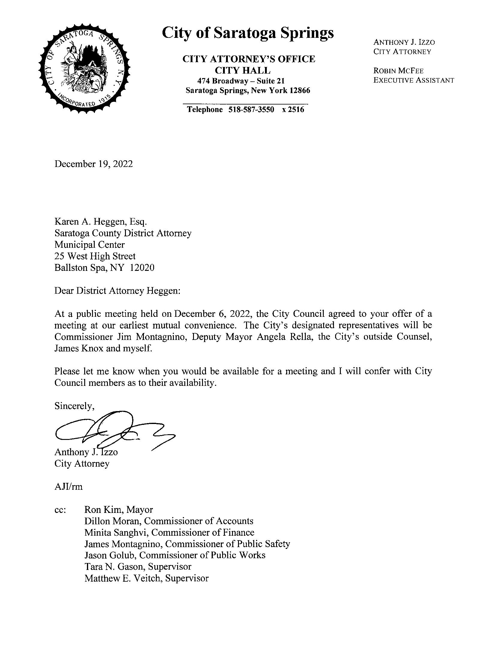 On December 19, 2022, some two weeks later, and with just three days until the hearing before the judge to review the temporary restraining order, Tony Izzo sent the letter below, finally asking for a time for the meeting.