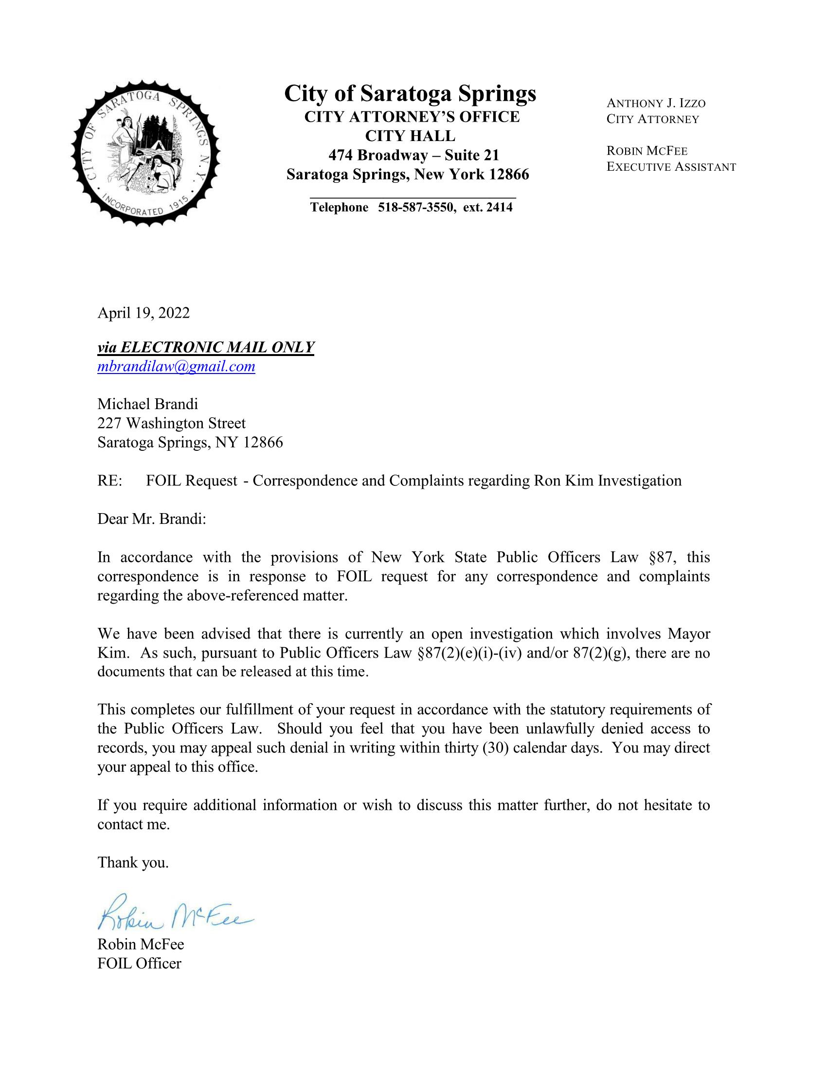 In April, the city received a FOIL request asking for documents associated with an alleged forged signature on one of Kim’s petitions for mayor. It was denied. The reason for the denial? “There is currently an open investigation.” Below is the denial letter.