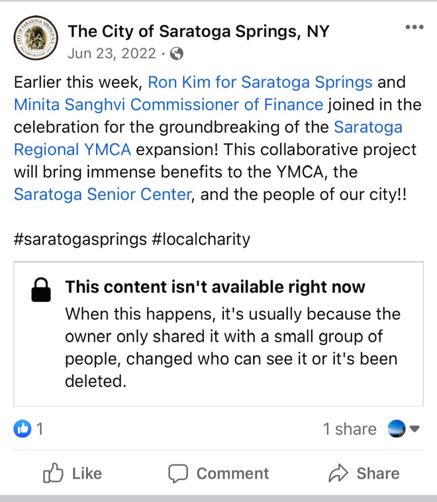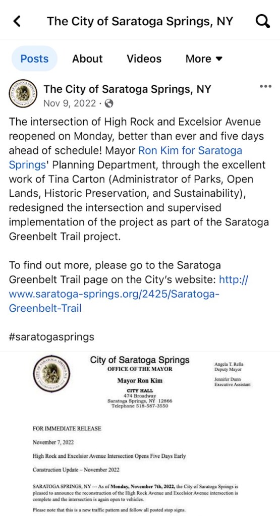 The first image above is from the Saratoga Springs official city Facebook page. As you can see, the post includes a link to Saratoga Springs Mayor Ron Kim’s Facebook campaign page , “Ron Kim for Saratoga Springs.”