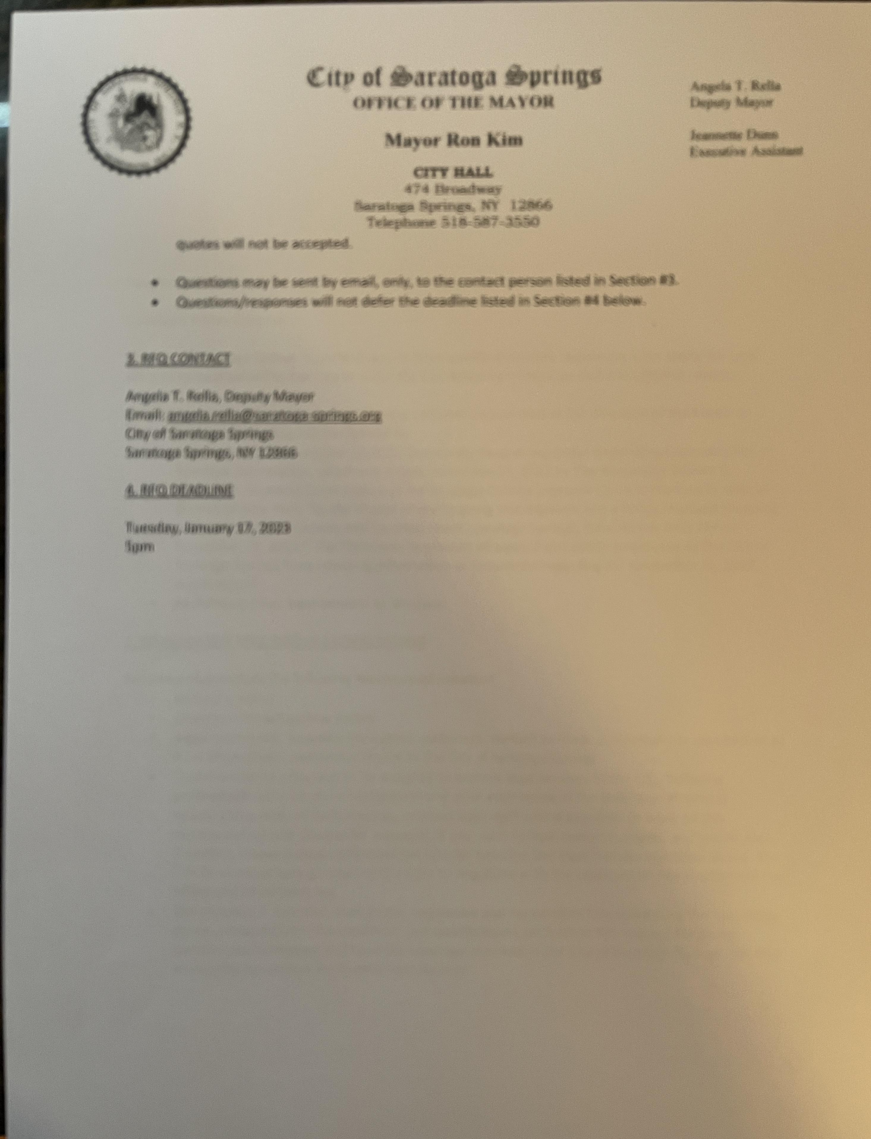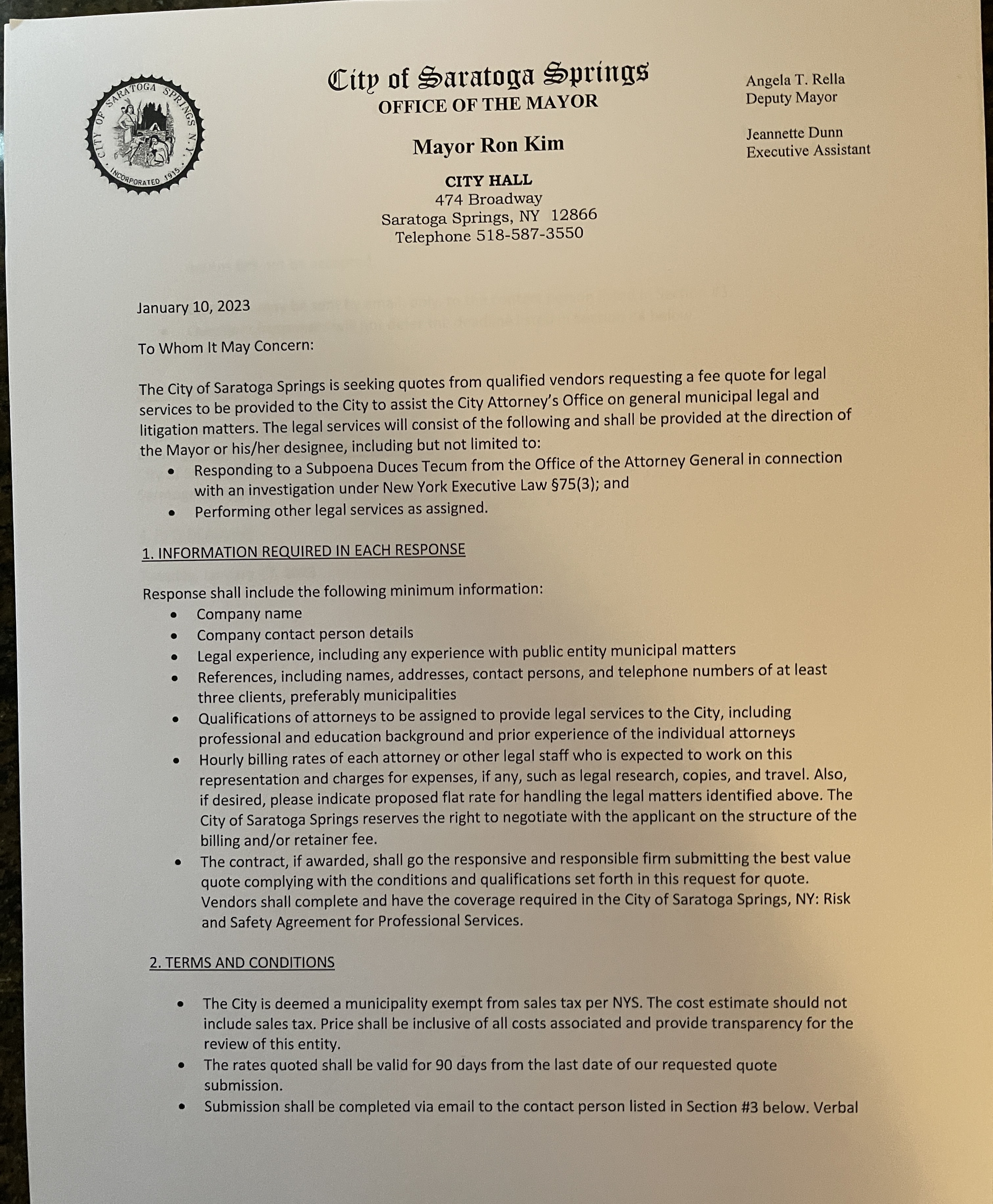 On Friday, January 6, 2023, Saratoga Springs Deputy Mayor Angela Rella delivered the above notice to the City’s Human Resource Office advertising an opening for a City Attorney. The salary for the new City Attorney is listed as $95,000 to $120,000 for an average work week of thirty to forty hours. (It’s a salaried position so what is the story with thirty hours?)