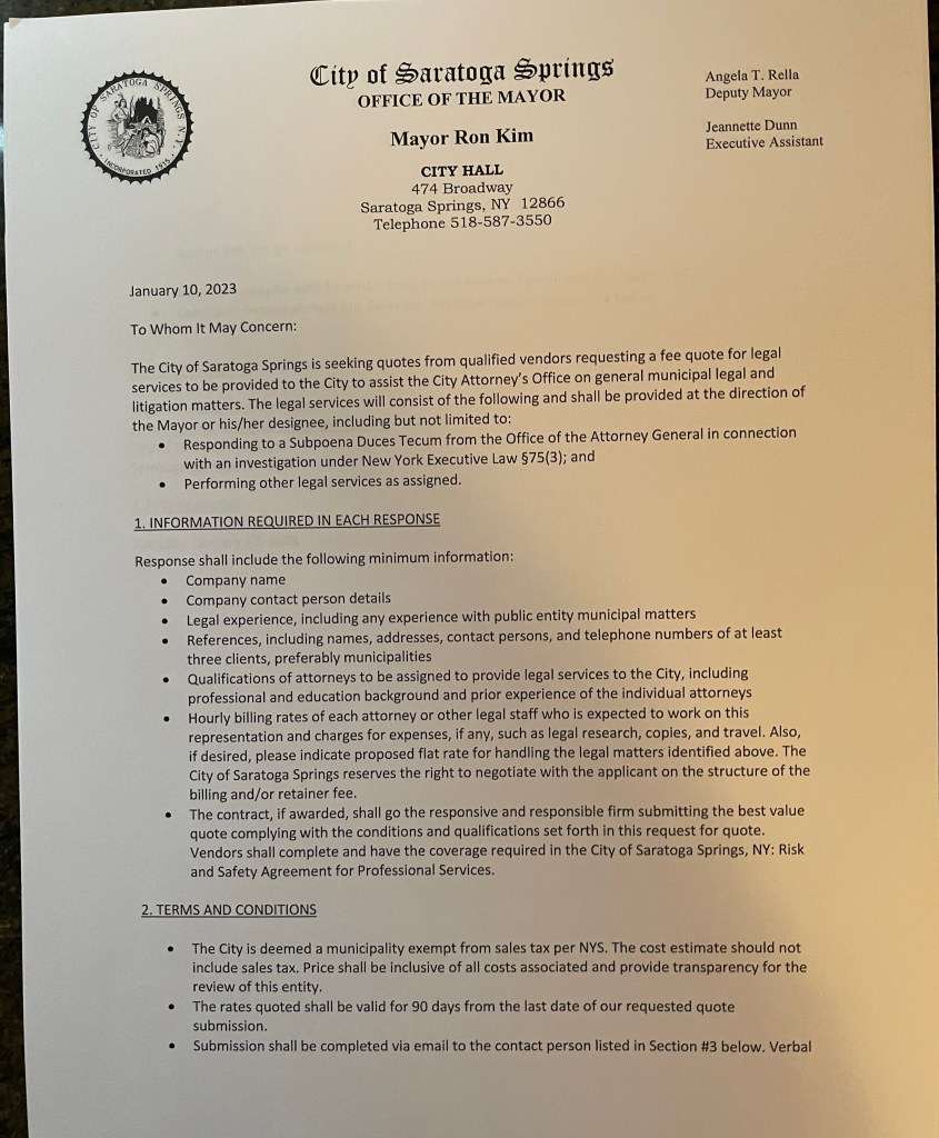 Saratoga Springs Mayor Ron Kim’s section of the January 3, 2022, Saratoga Springs City Council agenda included an “announcement” regarding paying attorneys representing past Mayor Meg Kelly and past Public Safety Commissioner Robin Dalton. Materials related to the “announcement” included invoices from the respective attorneys. Kim asserted that publishing the invoices was necessitated by his commitment to “transparency.” Unfortunately, this commitment does not extend to the Mayor’s own pursuit of engaging legal counsel.
