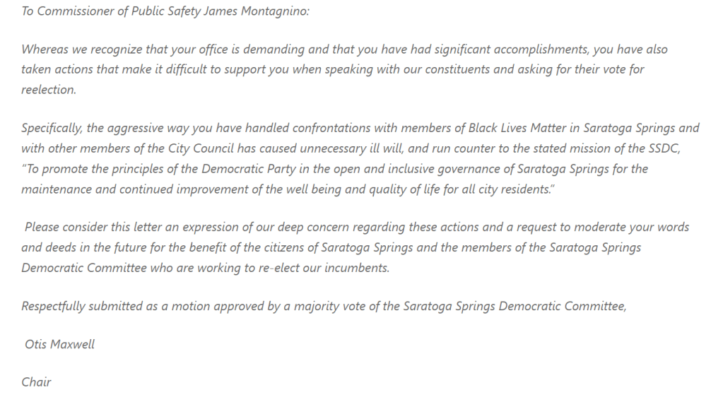 Saratoga Black Lives Matter has alleged that the Saratoga Springs Police Department has been responsible for frequent abuse of and violence against people of color in this city. One of their frequent chants in street demonstrations downtown has been, “How do you spell murderers? SSPD!”