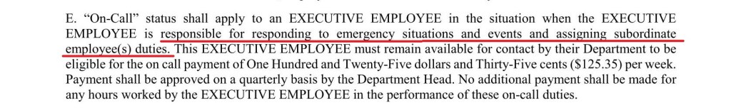 The ‘on call’ pay issue simply added insult to injury. The ‘on call’ pay issue was raised as a way of recognizing that one deputy, the Deputy Commissioner of Public Works had a more substantial duties than the other deputies, including the need to be on call after hours. (In my six years as Commissioner of Public Safety, I can’t think of any time that my deputy was required to be on call after hours. Yes, there were times that Eileen was contacted for reasons but there was no on call requirement or responsibility)
