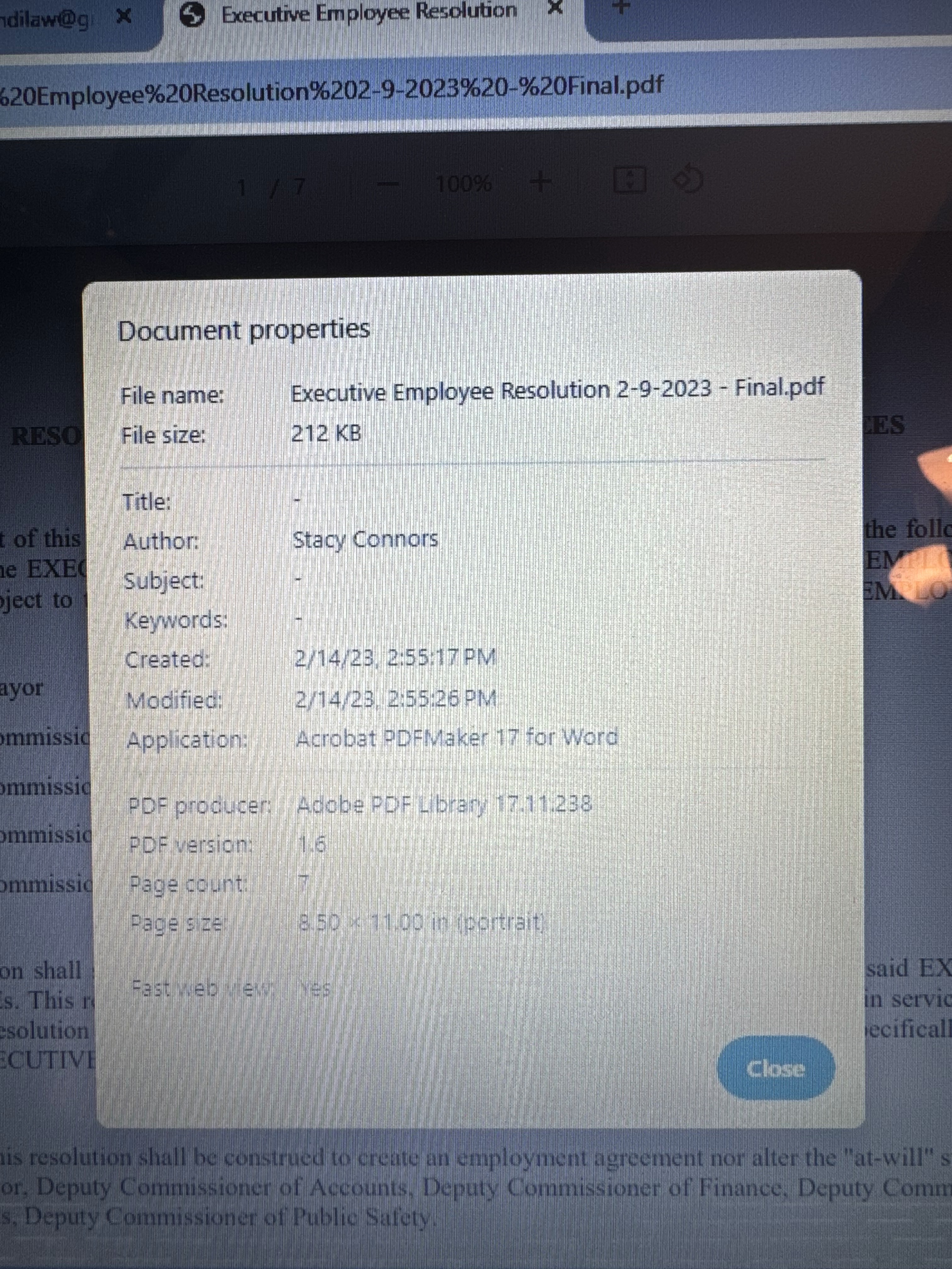 The doctored document that was uploaded to Laserfiche had something called meta-data attached to it. This file contains the record of who created the document and when. In this case the record shows Accounts Deputy Stacy Connors created it on February 14, 2023, five days following the adoption of the actual resolution.