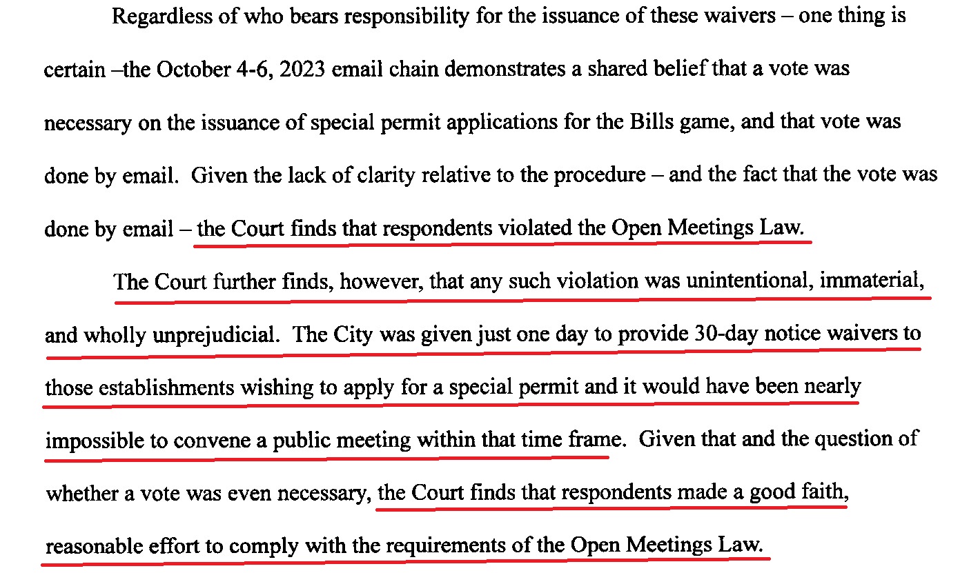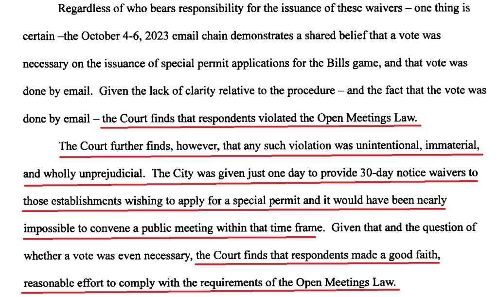 With respect to Judge Freestone, I am afraid she had her dates wrong. Governor Hochul issued her special waiver for bars on October 3, 2023. The Council began emailing about taking action on October 4. That meant that they had three days to schedule a meeting, and, in fact, they could have had their meeting on Saturday, so they actually had four days, not one day, as stated in Judge Freestone’s decision. All they needed was three Council members to convene for a few minutes.