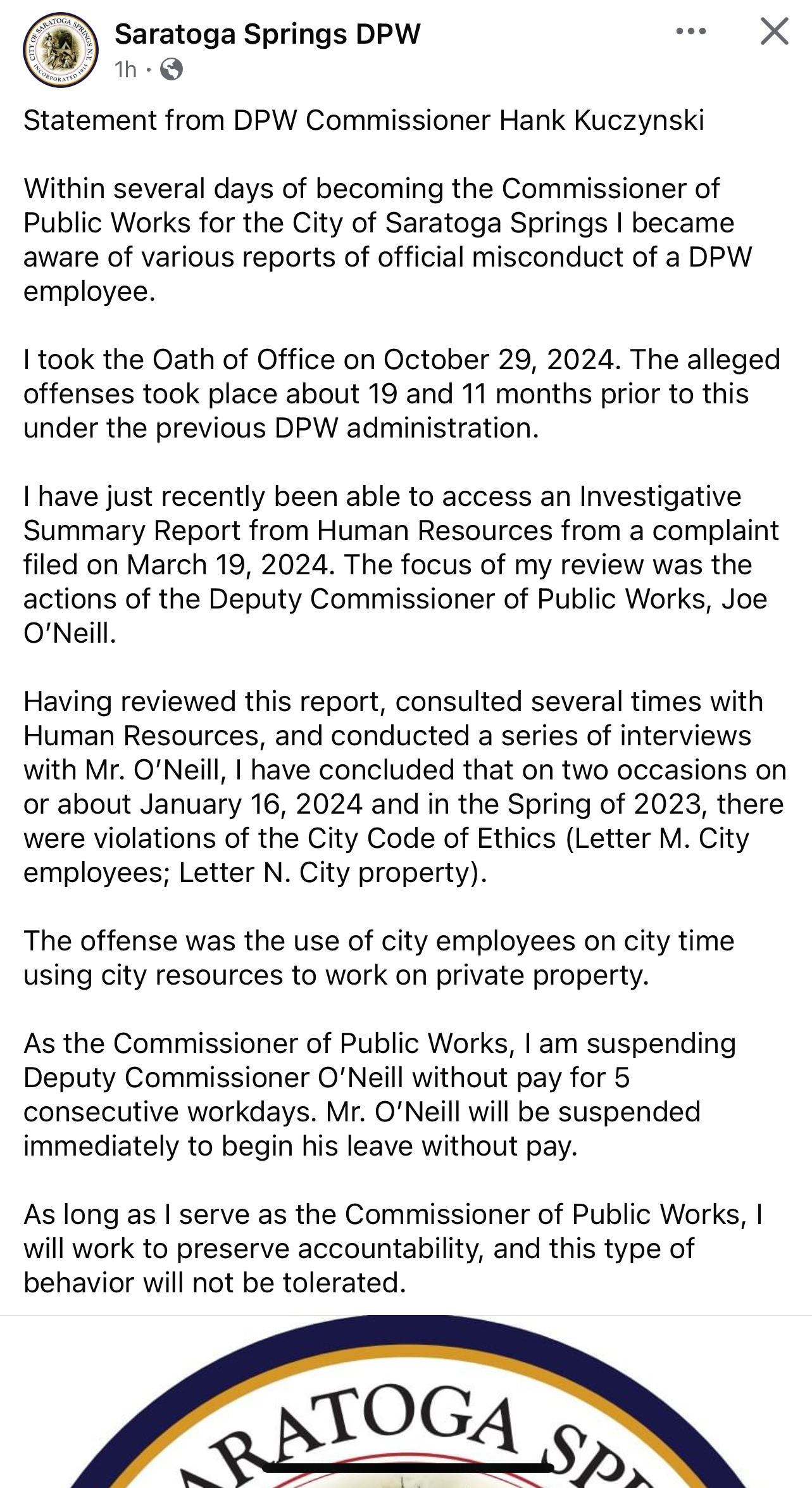 One thought on “Commissioner Kuczynski Suspends Deputy Commissioner Joe O’Neill For Five Days”