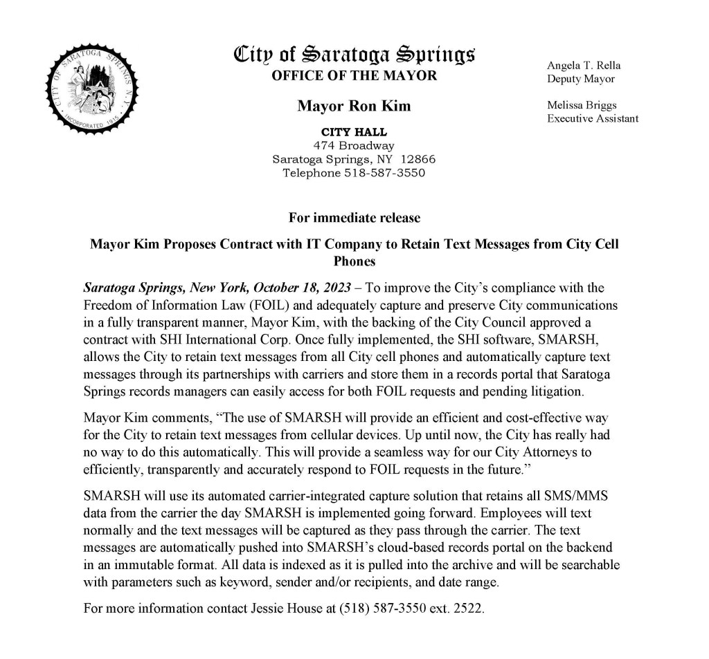 On October 18, 2023, Mayor Ron Kim issued a press release announcing that the city had purchased a software service called SMARSH. In cooperation with Verizon, the city’s cell service provider, the software would capture all texts from city cell phones and index them to make them easy to search.