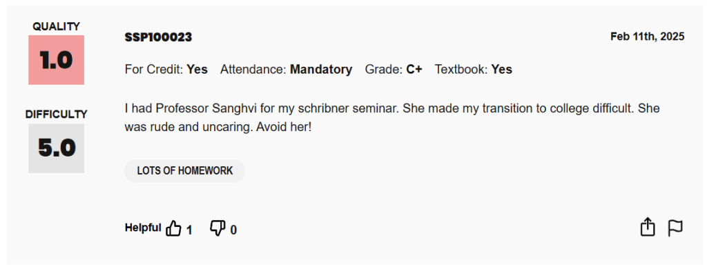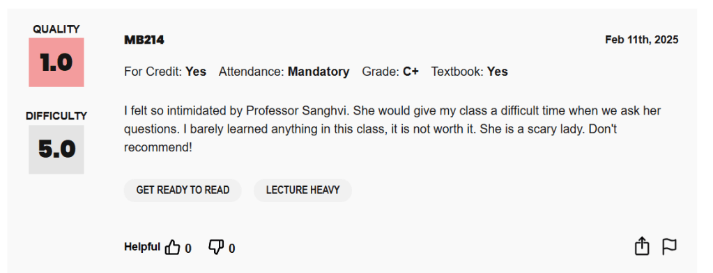 - Maybe it’s time for Sanghvi to leave politics. It seems she could benefit from self-reflection. Maybe reading self-help books to support growth in her ability to take accountability for her failures and acceptance of her need to improve would be helpful. She might consider hiring a life coach to work on learning interpersonal communication and interaction skills and help her develop empathy for others.