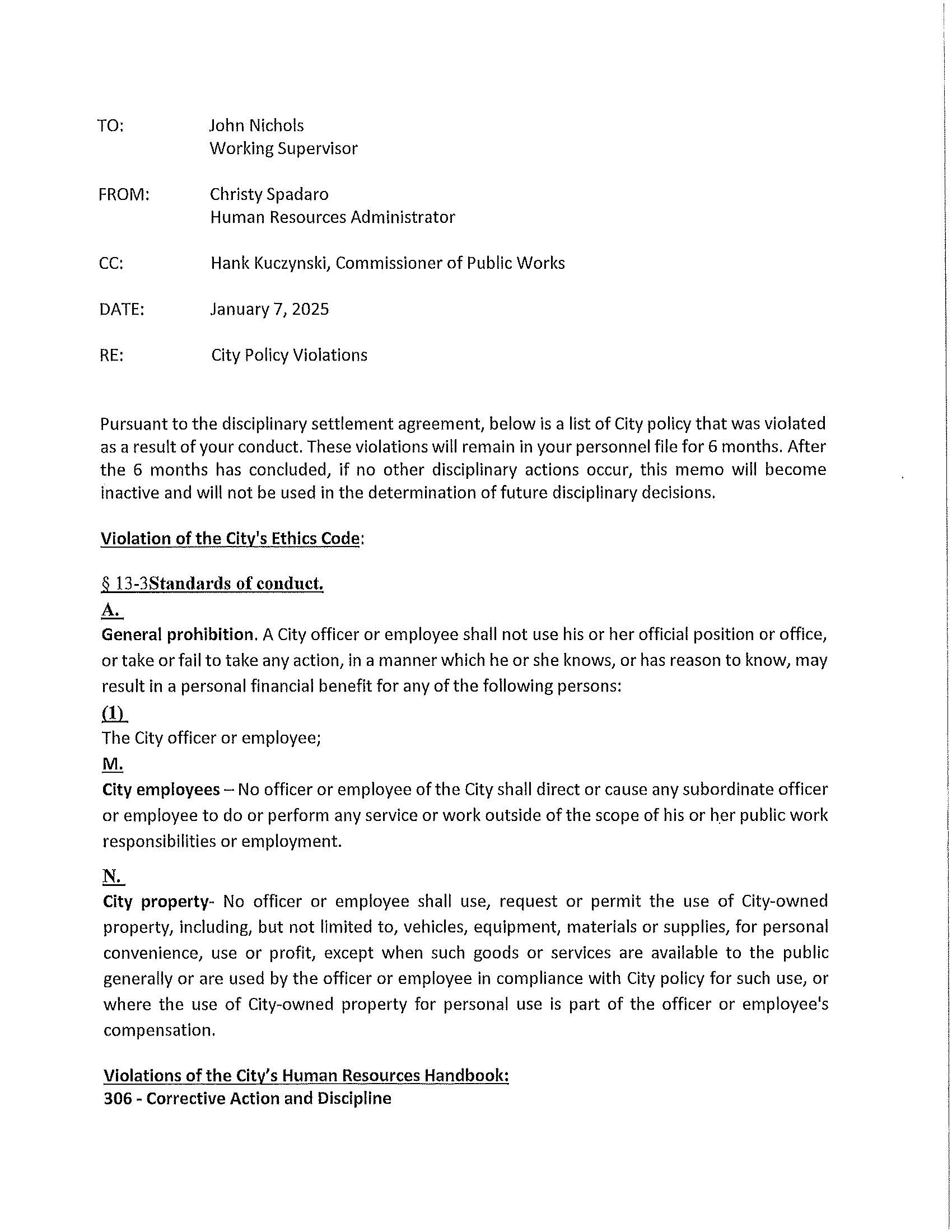 - A memo listing the city codes violated by Nichols sent by the Human Resources Department