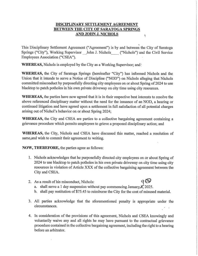On December 10, the Saratoga Springs Police Department began investigating the improper work by interviewing a DPW worker who had delivered the paving material to one of the private residences.