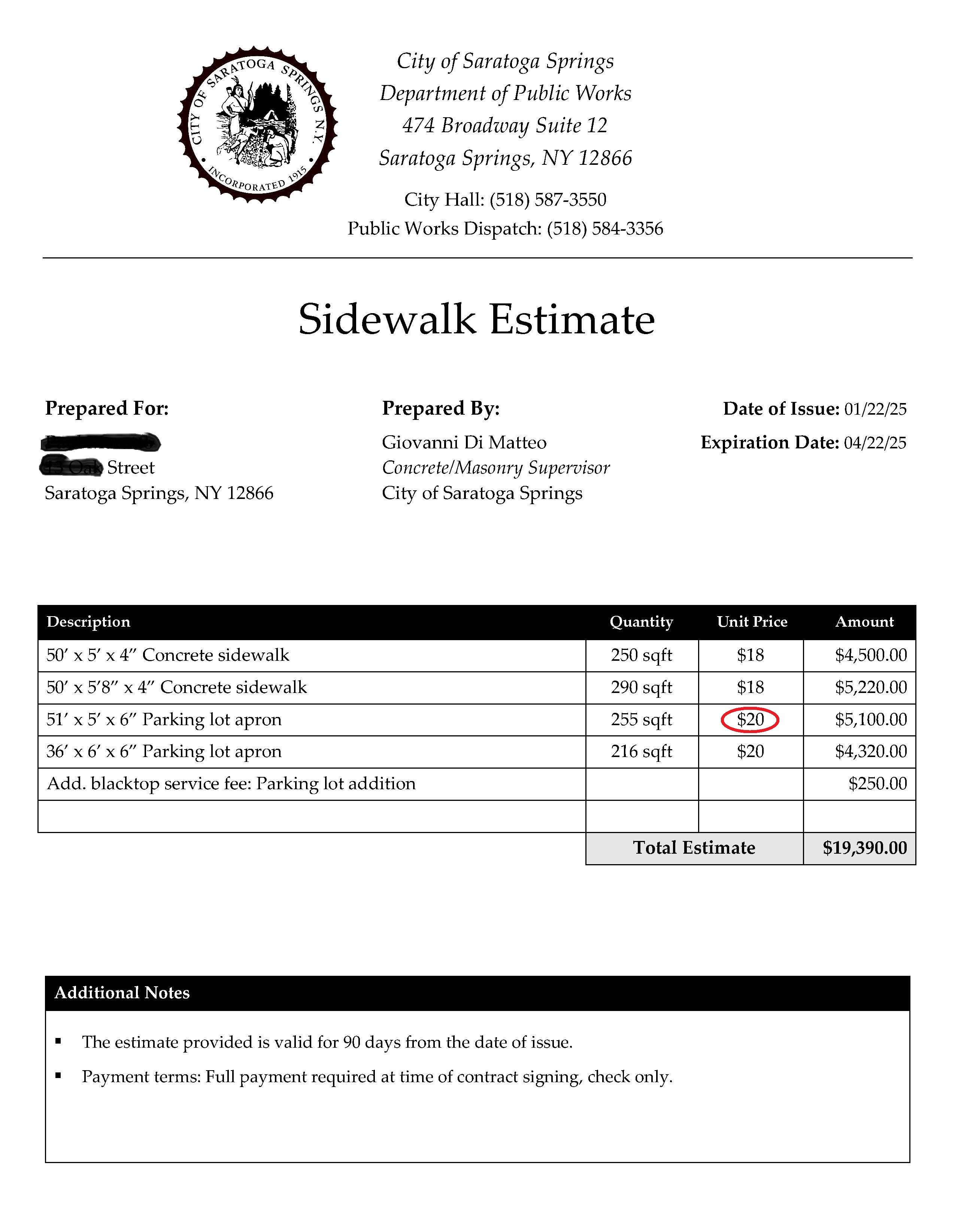 The following is a sample page from another contract. This contract page spells out the cost and scope of work. According to this document, the city currently charges $20.00 per square foot for paving.