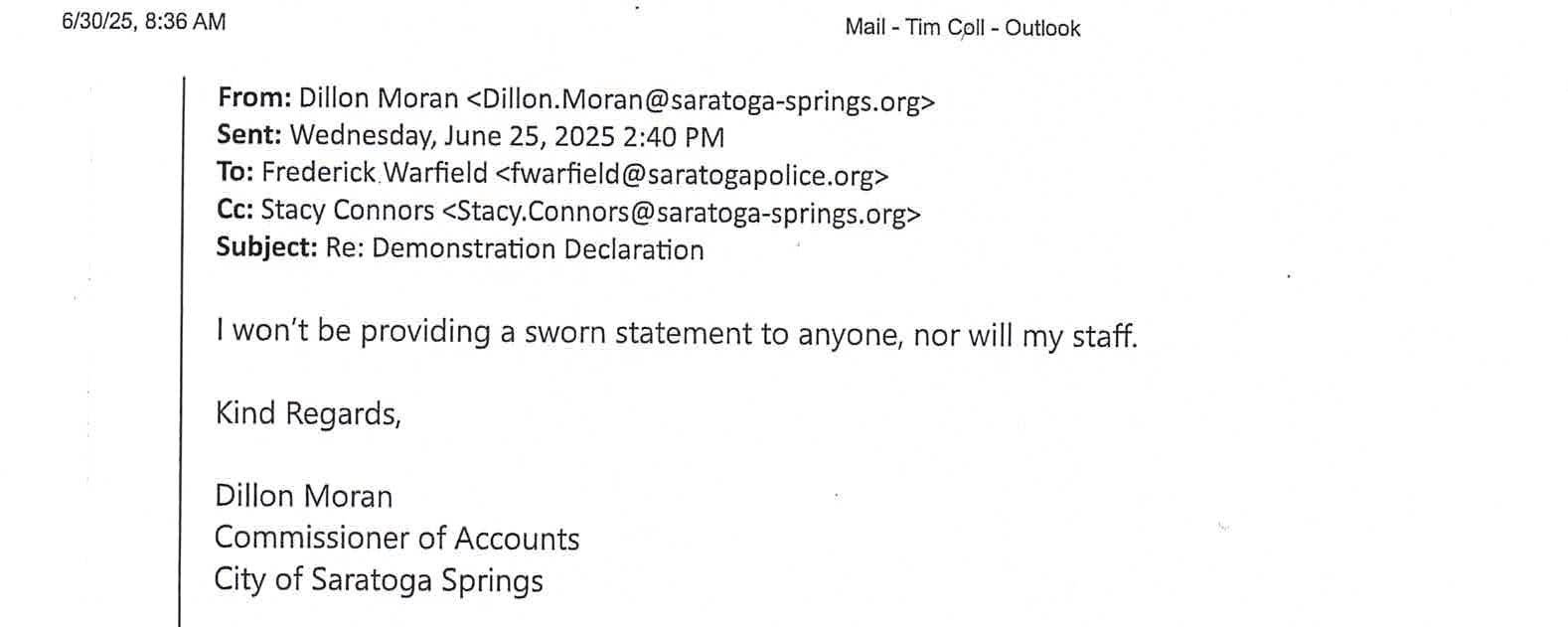On June 25, 2025, Saratoga Springs Commissioner of Accounts Dillon Moran willfully violated his oath of office and abused his authority when he refused to comply with a request by the City Police Department for a document required in a prosecution. The result of his impropriety was that the charges against a key ally of Moran were dismissed.