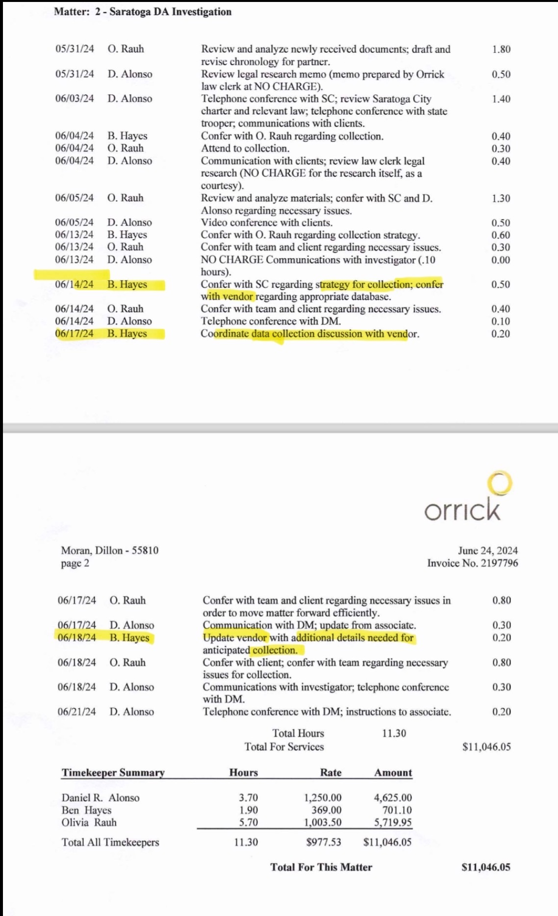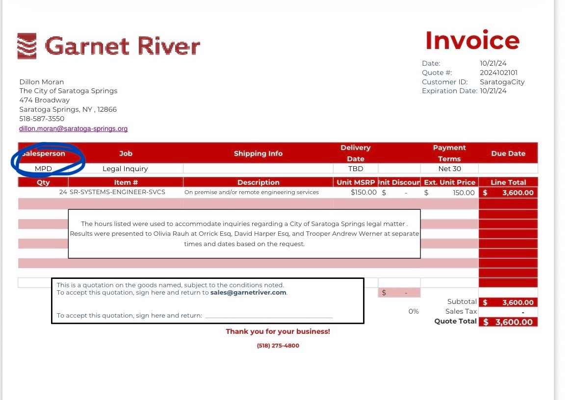 Apparently, Dillon Moran engaged Garnet River to work with Moran’s New York City Law Firm to scrutinize the city’s server for something related to the On-Call scandal. We know very little about the details at this point. We have an invoice from 2024 and a time sheet from the lawyer indicating billing for conversations with Garnet River.