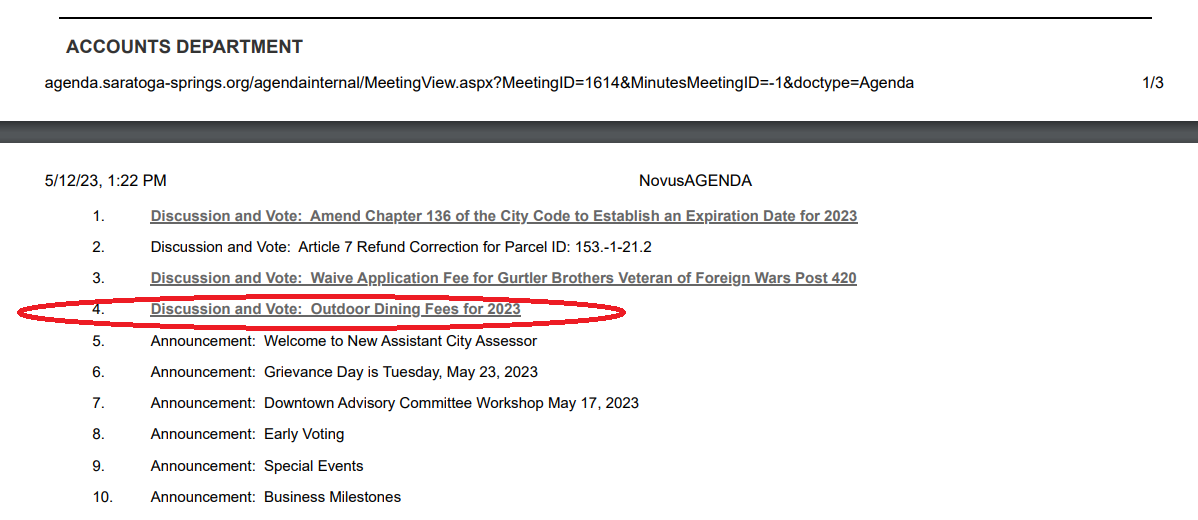 On May 16, 2023, there was a City Council meeting. Moran had two items on his agenda for that meeting regarding outdoor dining. One was a public hearing on amending the temporary outdoor dining ordinance’s season closing date, and the other was to establish the fee schedule for temporary outdoor dining.