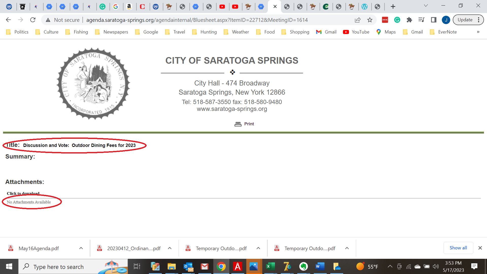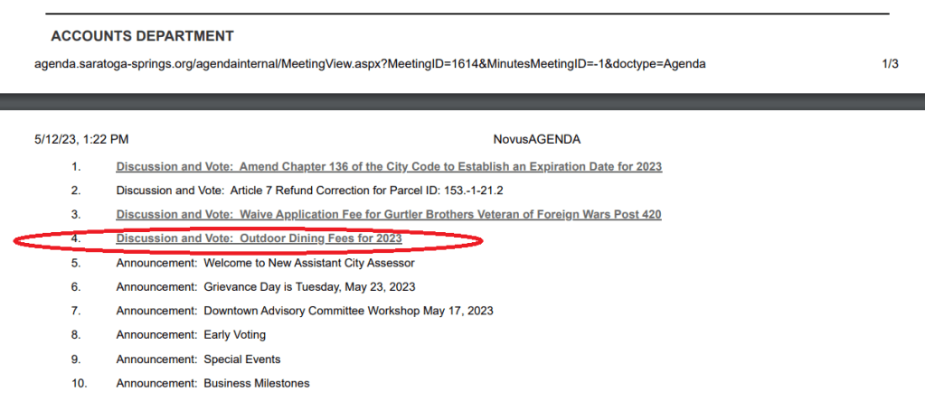 Consistent with the management problems that plague the city website overseen by Commissioner Sanghvi, the agenda for the meeting did not include the resolution establishing the temporary outdoor dining fees. The agenda item was there, but clicking on the link resulted in a message that there was no available document (the actual resolution).