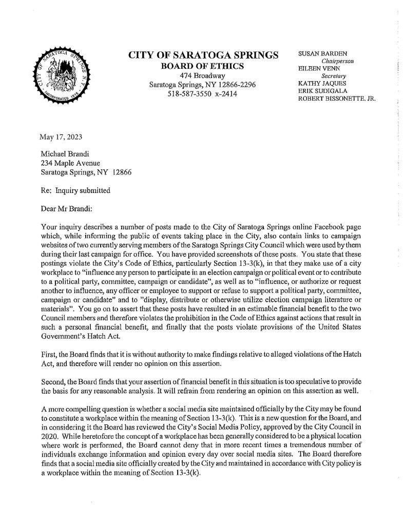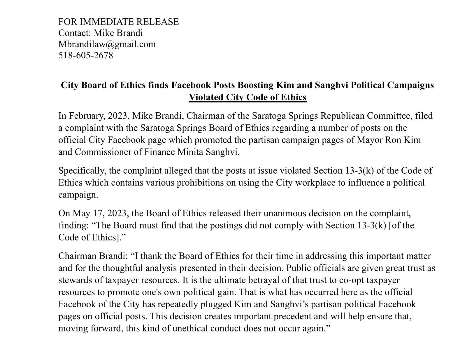 [I received the following two releases from Mike Brandi, the chair of the Saratoga Springs Republican Committee. Brandi had submitted a complaint to the city’s ethics board against Mayor Ron Kim and Finance Commissioner Minita Sanghvi, who had violated the city’s ethics code by putting links to their campaign websites on the city’s Facebook page.