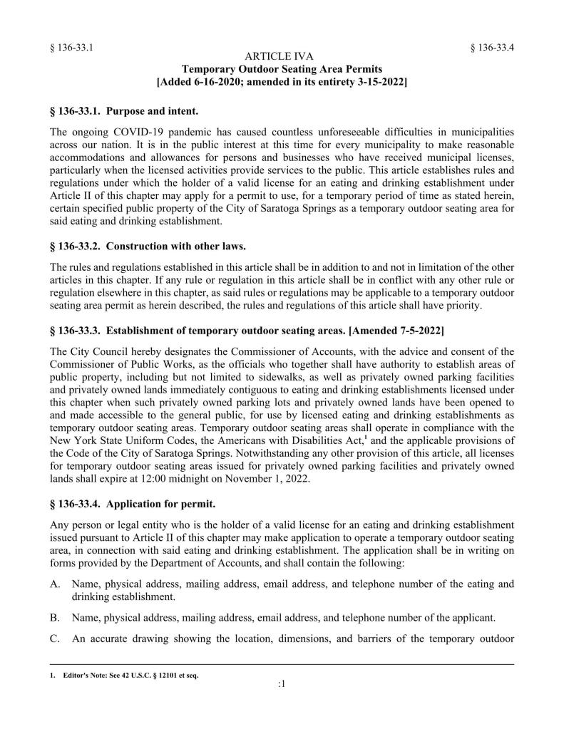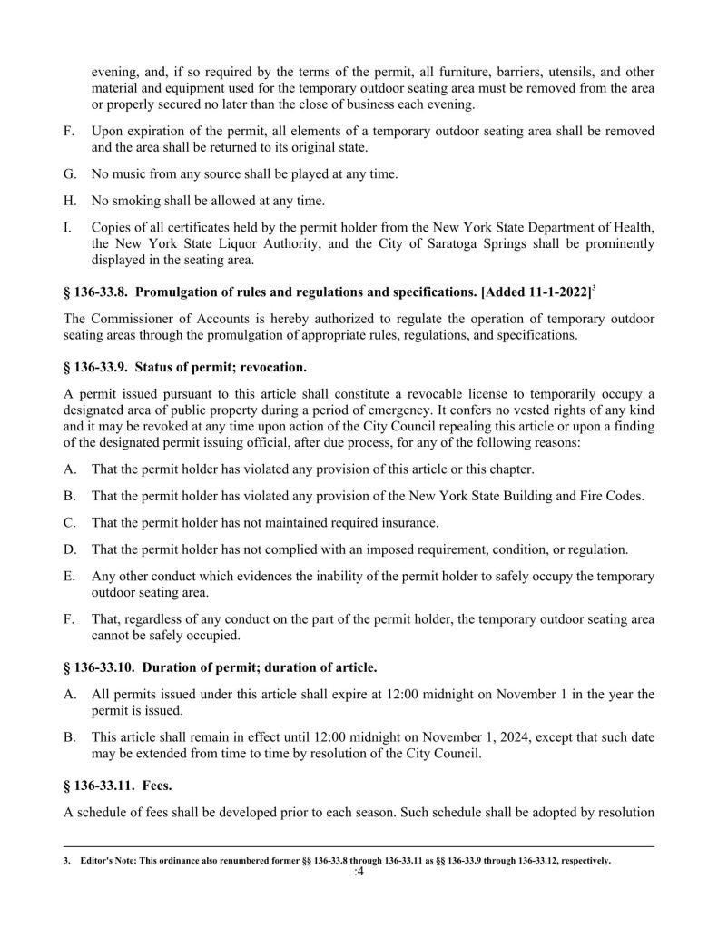 Notwithstanding Commissioner Moran’s imperious pronouncement that the starting date I was looking for is in the legislation, it is not there. Below I have published the full city code on temporary dining, and if readers are skeptical, they are welcome to try to find it themselves. As the ordinance has a hard closing date (November 1, 2022), it seemed reasonable that there would be a starting date.