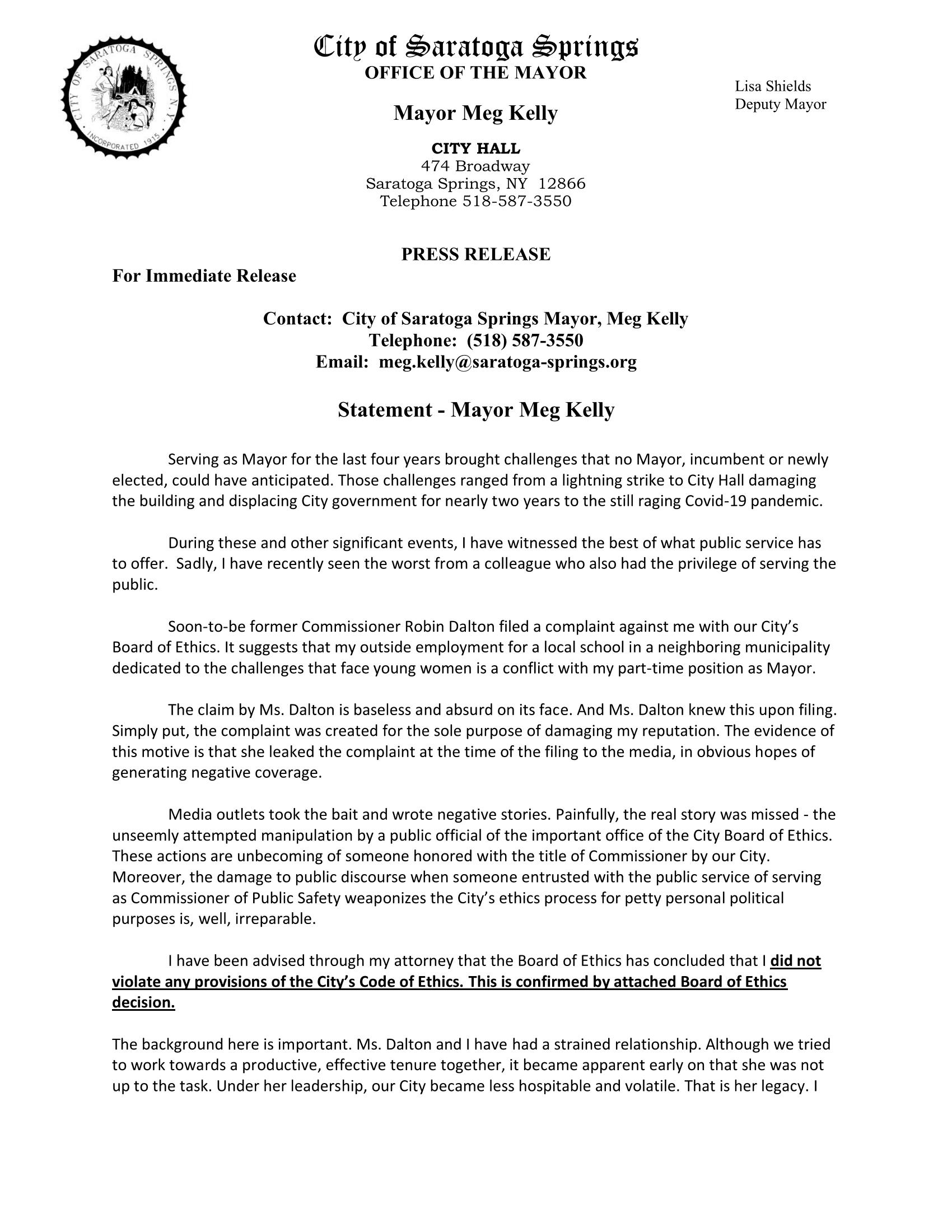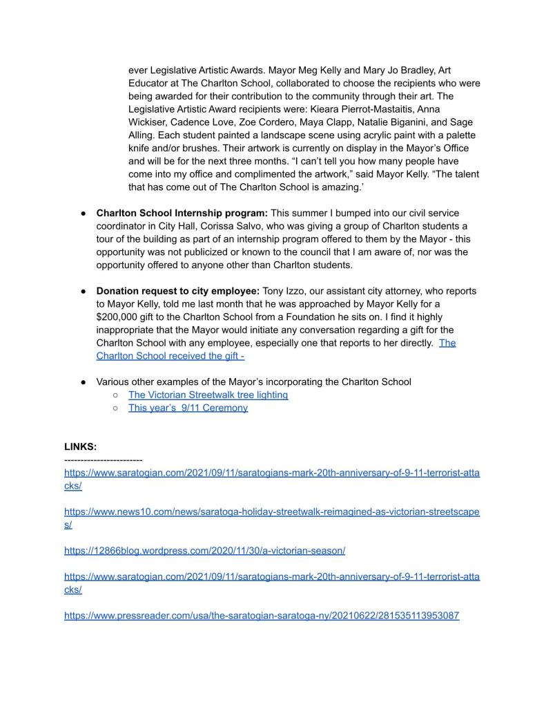 Regardless of her source, Ms. Sanghvi formulated a misleading narrative about me and my desire to pursue employment with the city. Her unfounded assertions to the Times Union that Mayor Kelly was involved to assure I have “a job come January” and that she “tried to appoint me as the head of the planning department” are patently false. The job to head the planning and building teams was posted in September. I am highly qualified for this position, having overseen the department for four years as Deputy Mayor and stepped in to lead when Bradley Birge retired in January 2021. As is my right, I submitted my application through an open and transparent process with Civil Service. I believe that my experience, contributions, and leadership would be valuable to the City in this role. In fact, the incoming mayor was notified by HR several weeks ago that Mayor Kelly decided to let him fill the position.