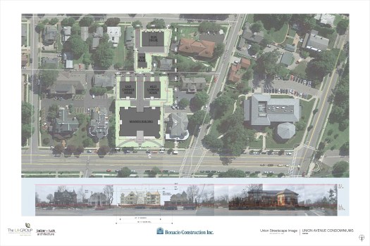 Previous Image Next Image Moore Hall Plan-31 Top is aerial view of building positions Bottom is streetscape